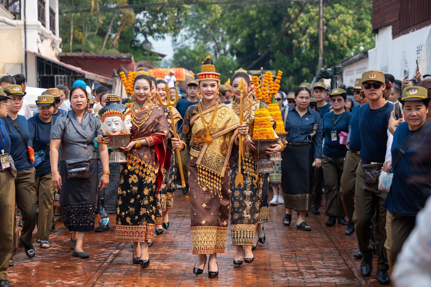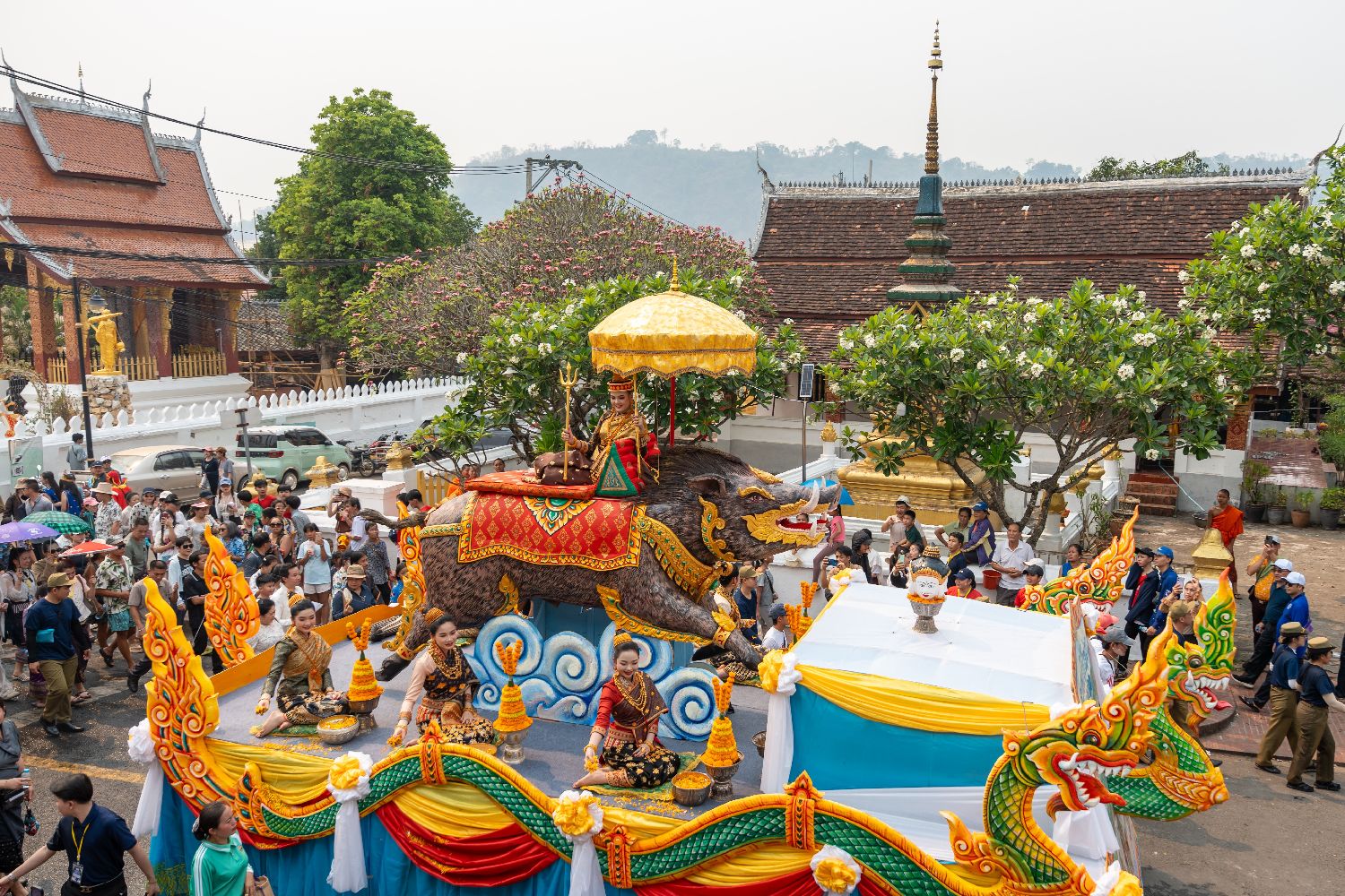4月15日,在老挝琅勃拉邦,“宋干小姐”在泼水节庆祝活动期间参加巡游。