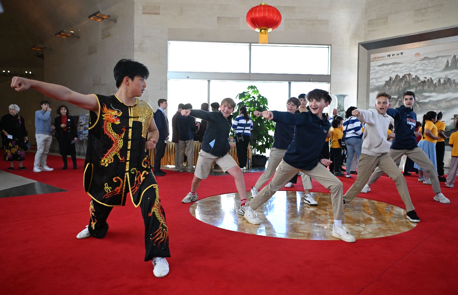 4月21日,在位于华盛顿的中国驻美国大使馆,来自嵩山少林武术职业学院的演员带领美国学生学习武术动作。