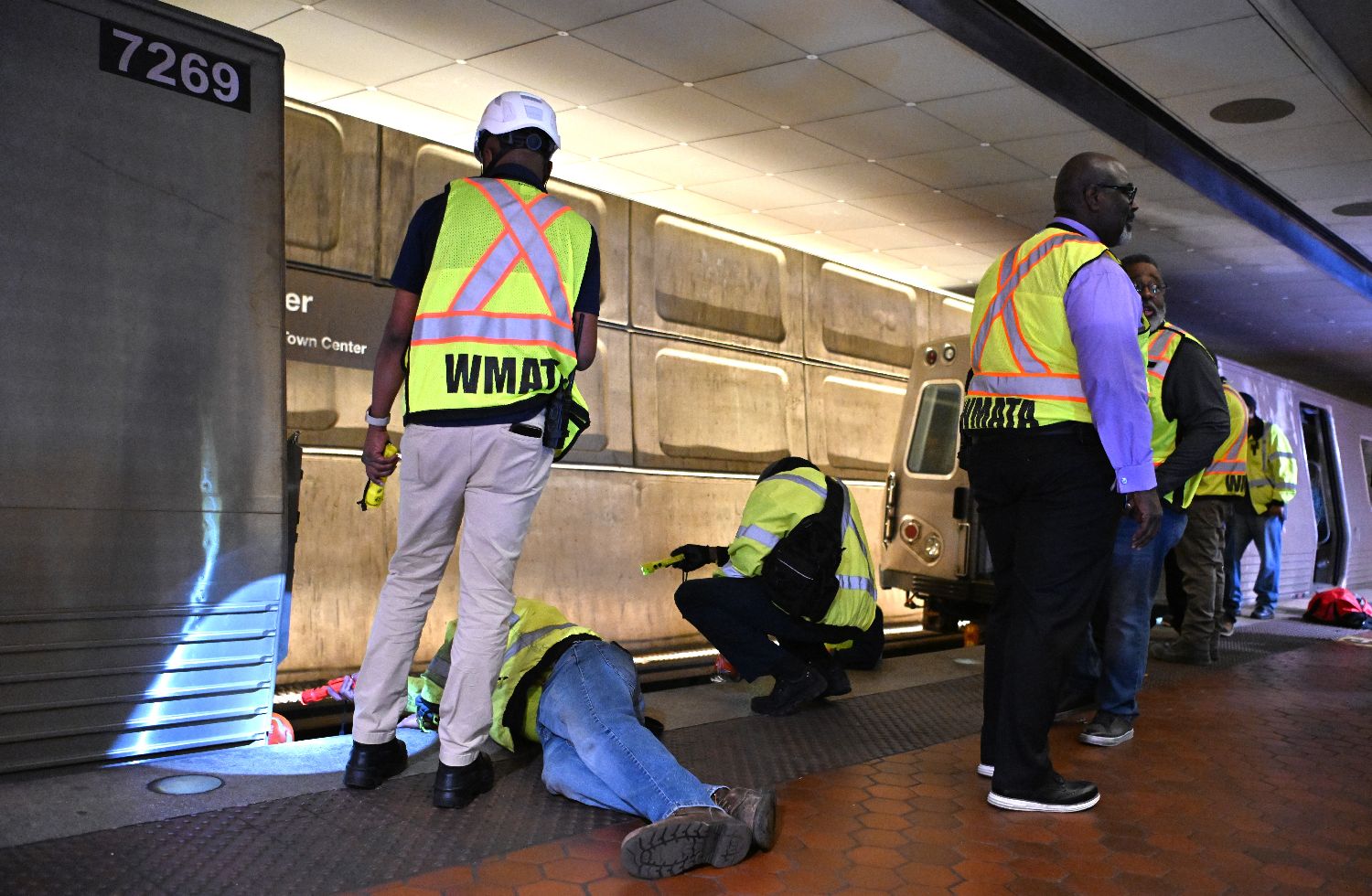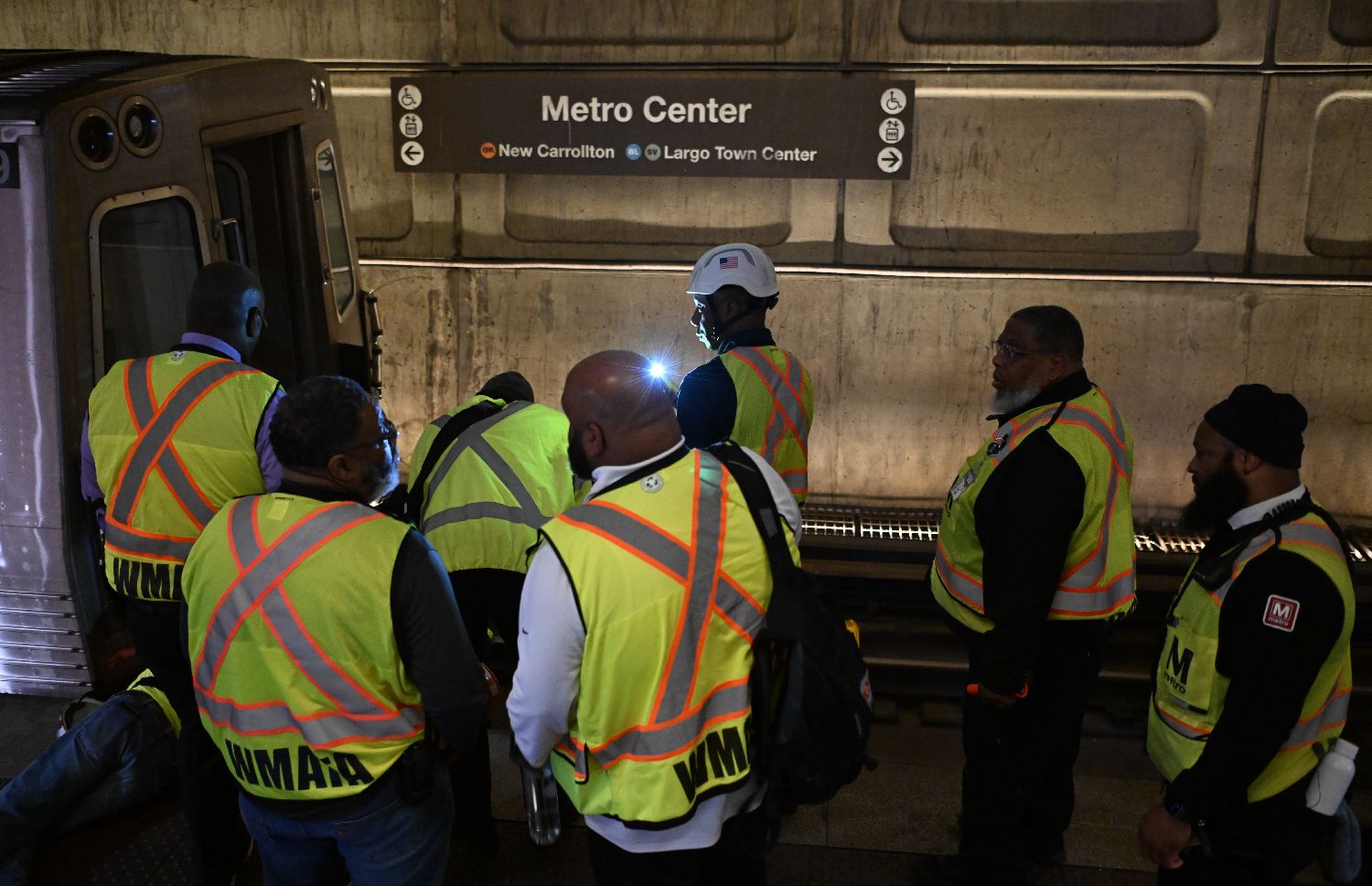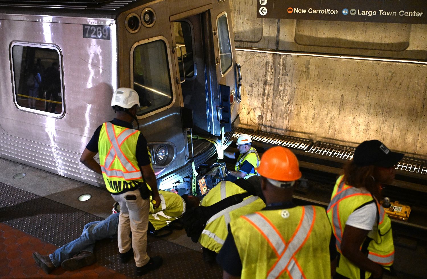 4月22日,在美国华盛顿的地铁中心站,华盛顿都会区交通局工作人员处置发生相撞事故的地铁列车。