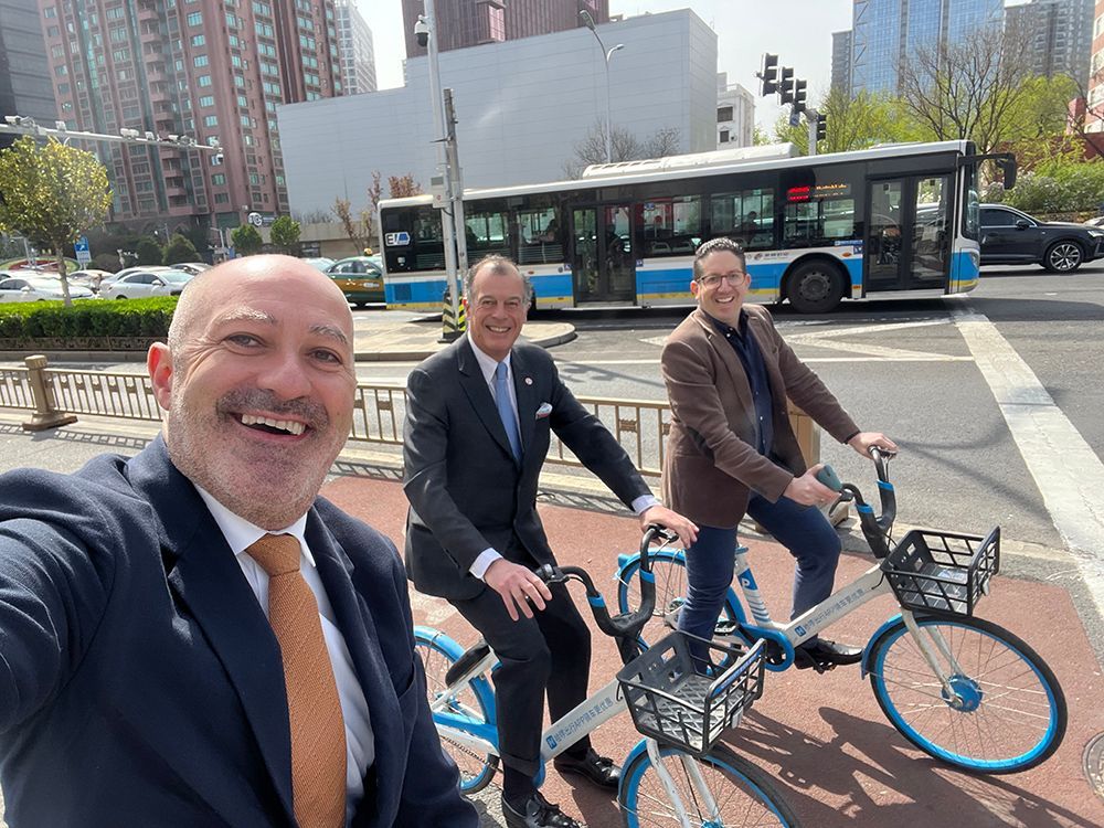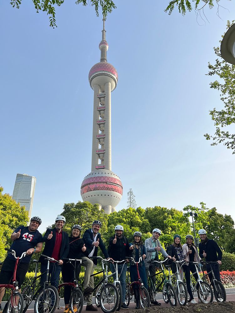 图为傅杰森与同事在上海骑行。