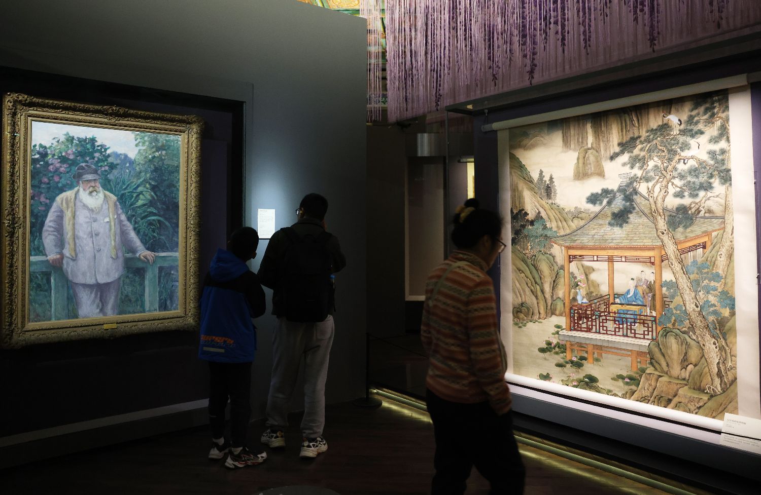 该展通过“雅集”“鉴藏”“游山”“静修”“观花”“畅音”等六项园林雅事,选择200余件有代表性的中外展品,巧妙将园林景观与文学、戏剧、历史典故等元素相融合,呈现中外园林的艺术之美。图为4月3日,北京故宫午门展厅,《克劳德·莫奈肖像》与郎世宁画作《弘历观荷抚琴图》两相对望,恰似莫奈与乾隆跨时空“对话”。(图片来源:均为卞戈摄)