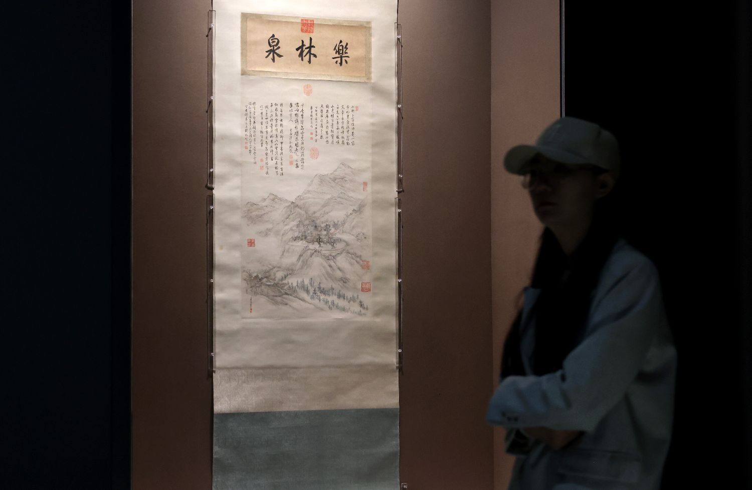 展览主题名“乐林泉”取自展品《皋涂精舍图轴》上乾隆御笔亲题的诗塘。“林泉”是中国古人对自然山水的诗意表达,“乐”于“林泉”,则是人们在园林中寄托的栖居追求。图为4月3日,观众在北京故宫午门展厅参观清代李世倬《皋涂精舍图轴》。