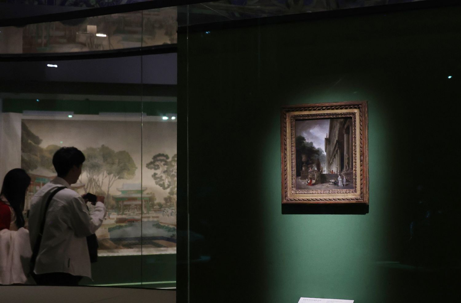 4月3日,展出的《美第奇宫的柱廊和花园》(1870年后)与左侧的中国园林图景形成对比。