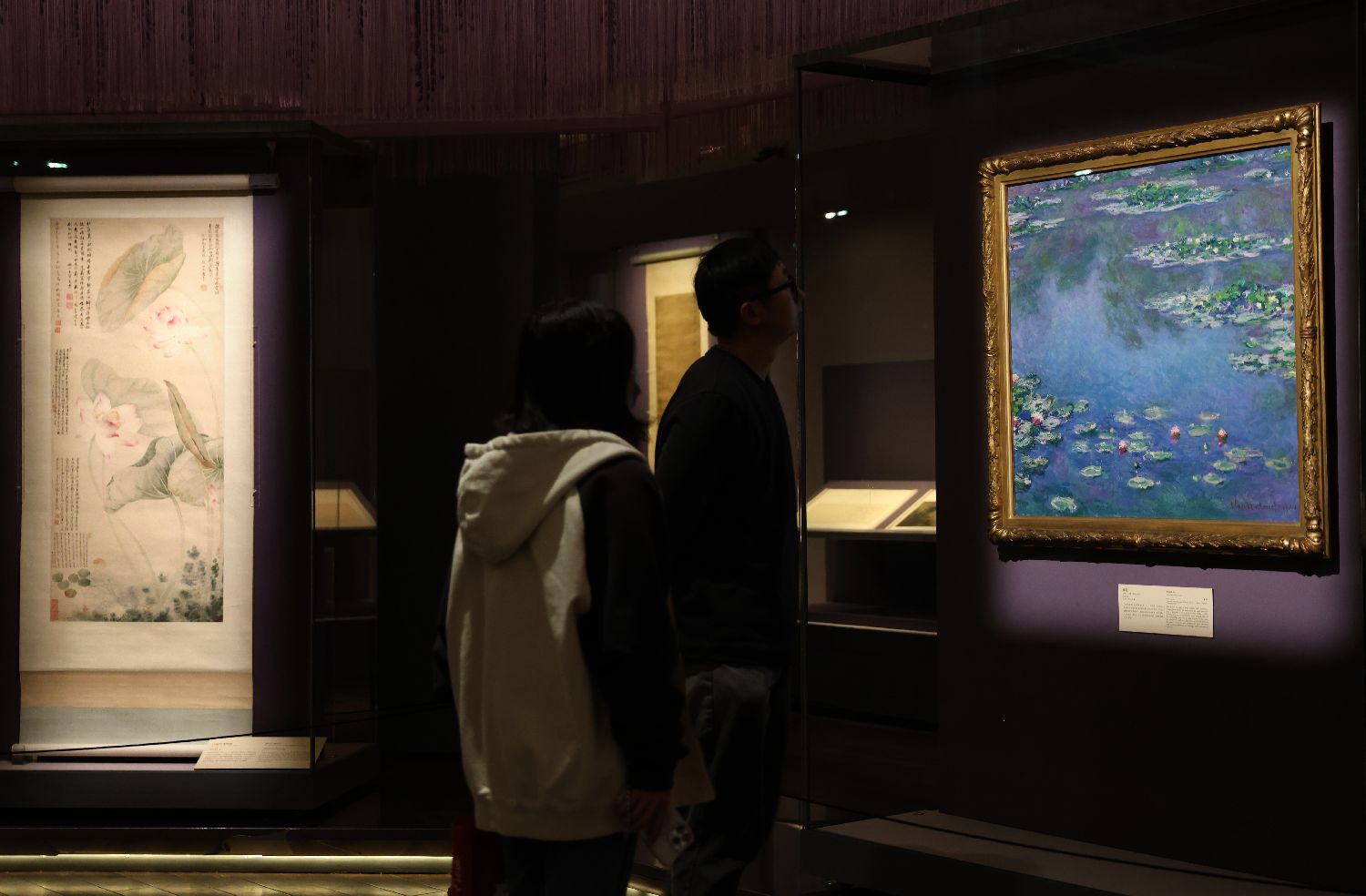 4月3日,观众在展厅内欣赏莫奈的《睡莲》,右侧为唐炗、恽寿平的《合绘红莲图》轴。
