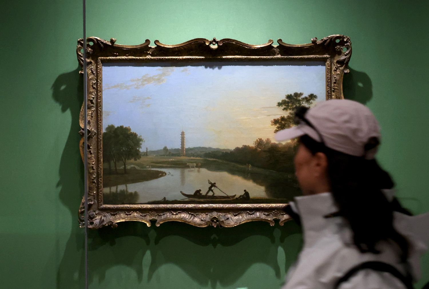 4月3日,观众参观展出的《邱园中的塔和桥》(1762年)。十八世纪,“中国风”席卷英伦,设计师们开始在西方园林里布置中国的亭廊、宝塔,在想象中构建来自东方的异域风情。