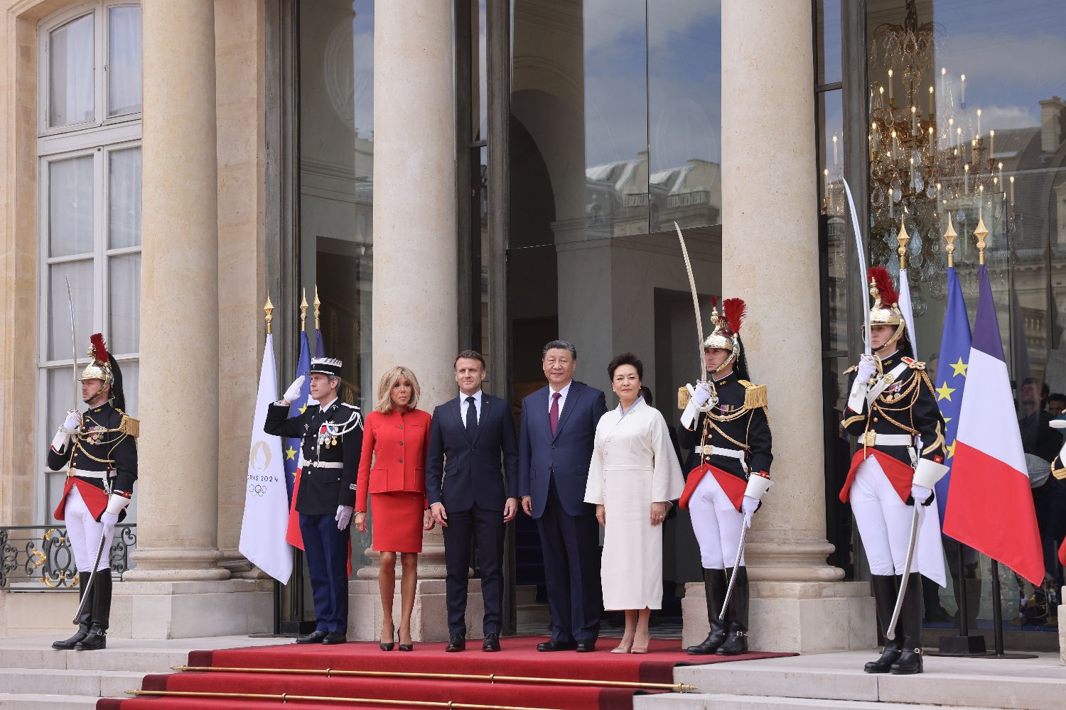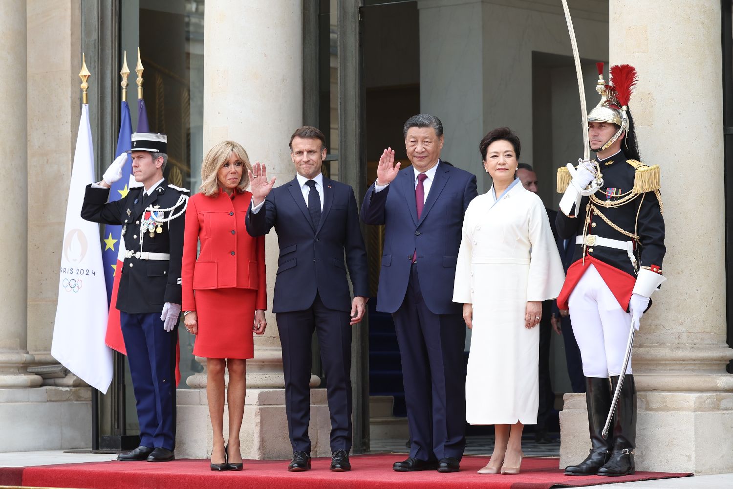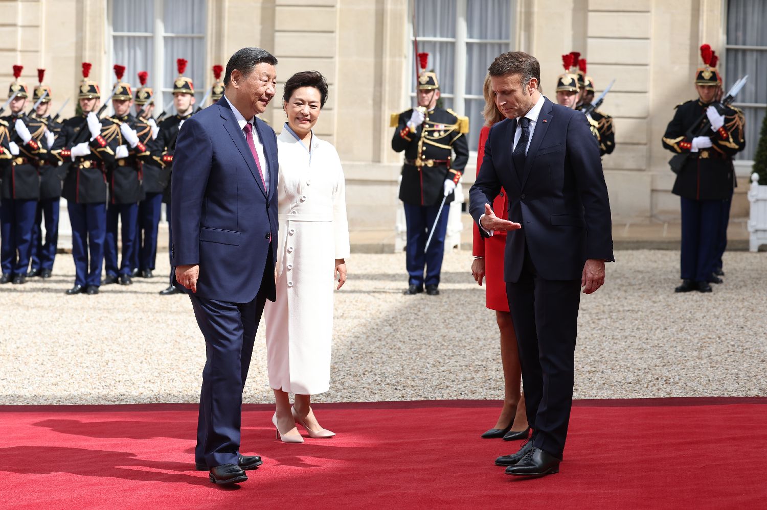 5月6日下午,中国国家主席习近平在巴黎爱丽舍宫同法国总统马克龙举行会谈。图为马克龙和夫人布丽吉特迎接习近平和夫人彭丽媛。(图片来源:中新社)