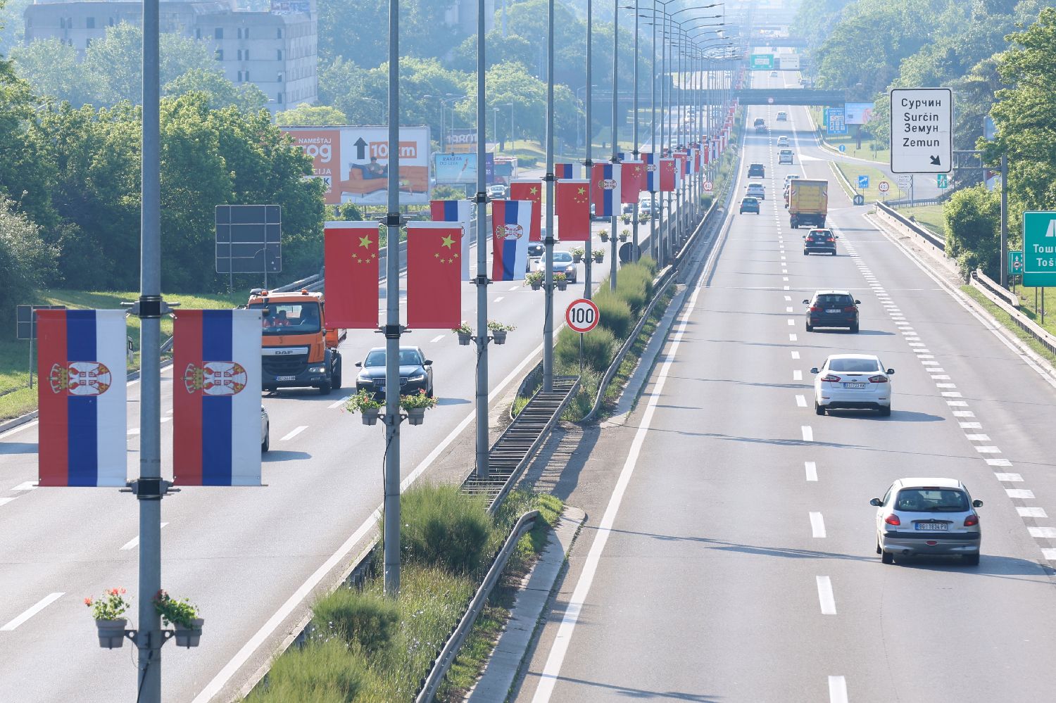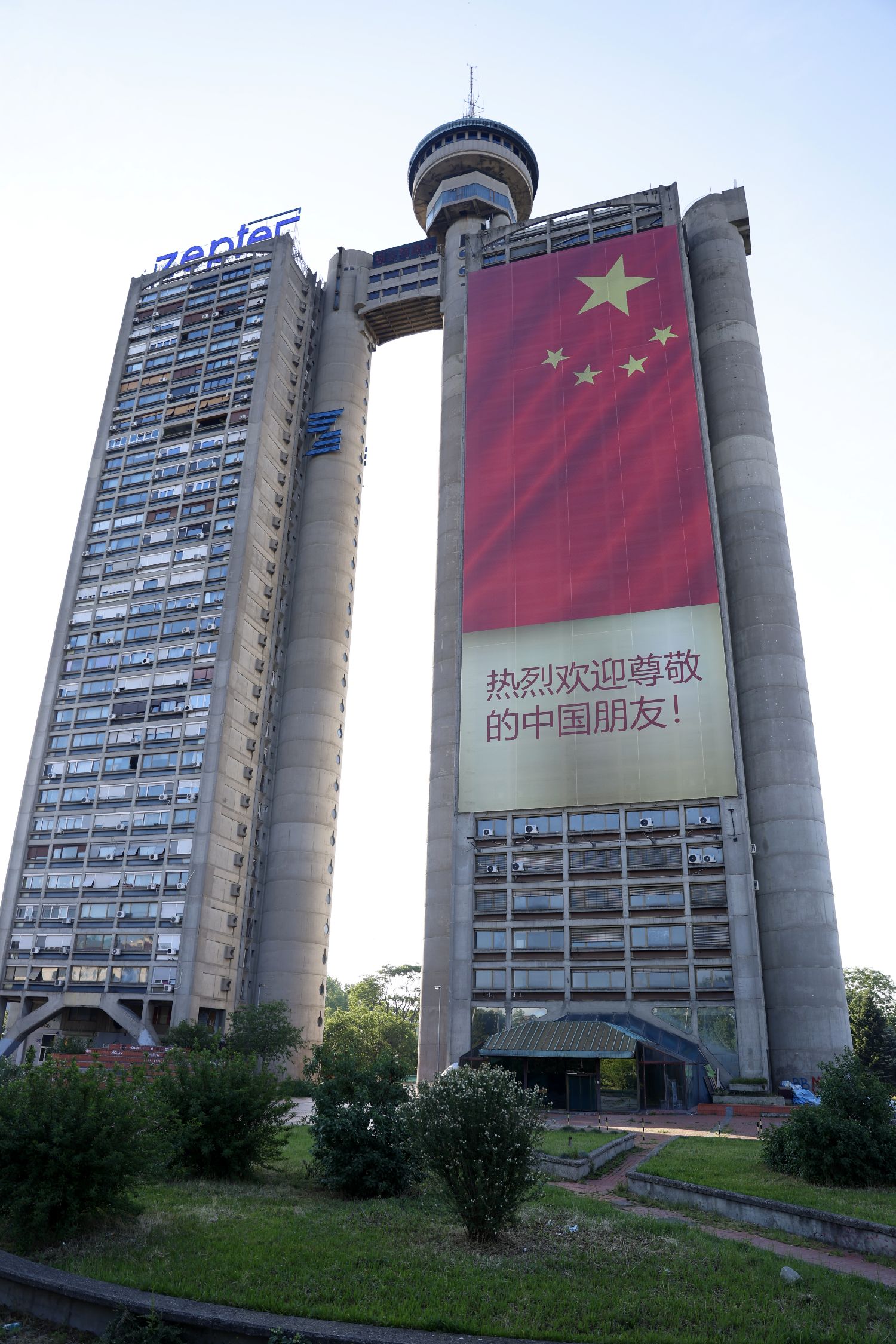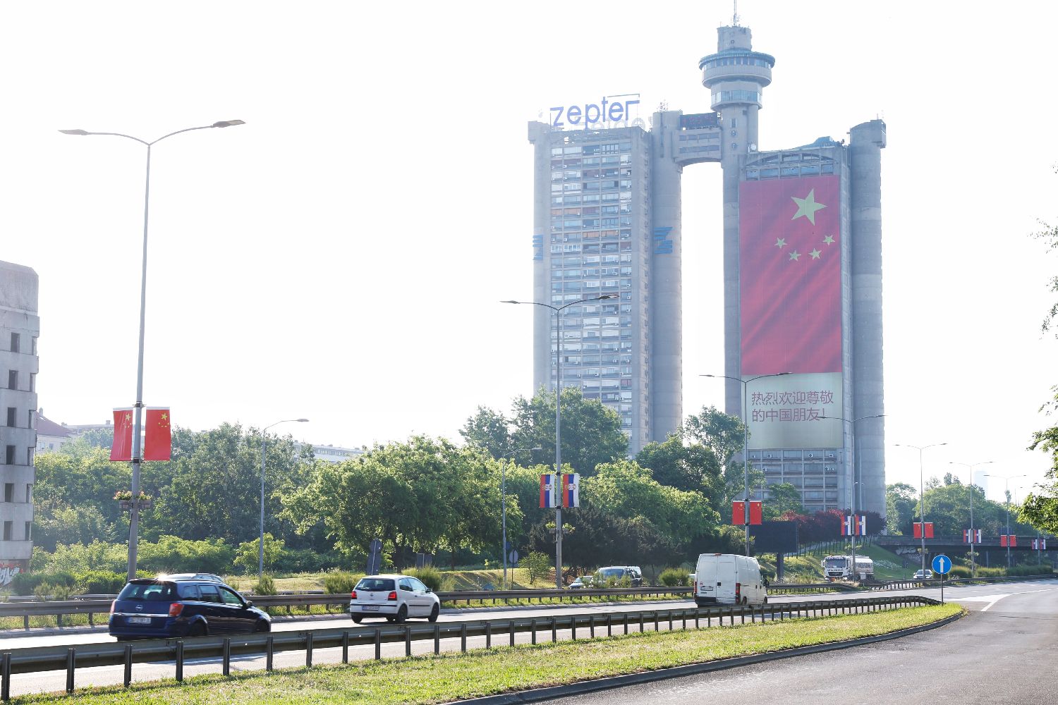 被称为“贝尔格莱德西大门”的建筑格内克斯塔上悬挂起巨幅五星红旗,“热烈欢迎尊敬的中国朋友”等标语格外醒目。