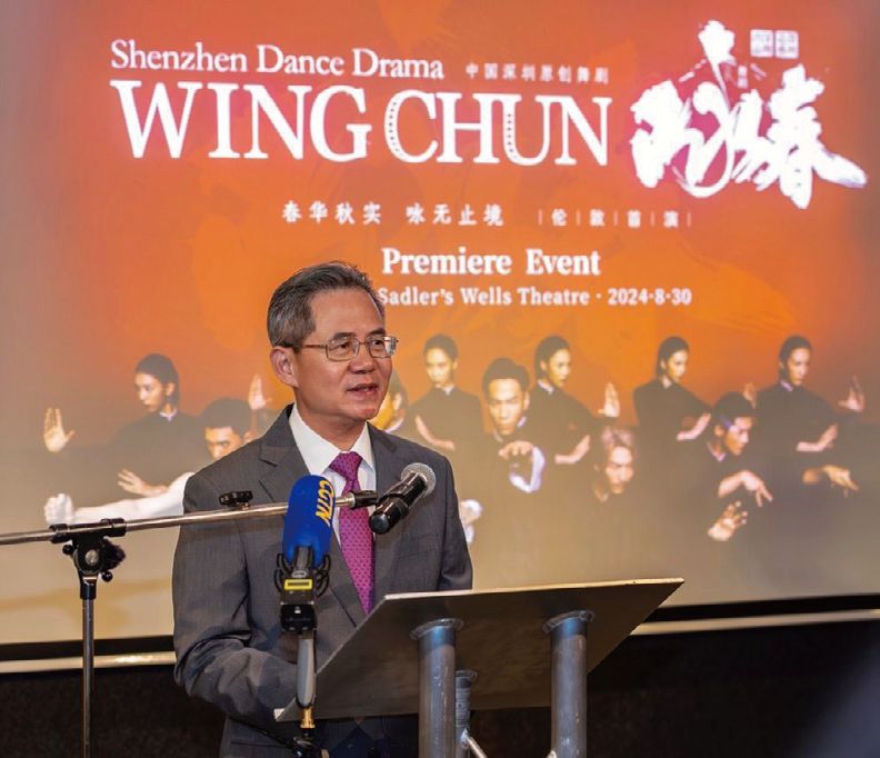 郑泽光大使在致辞中盛赞,深圳是中国改革和科技创新的前沿城市,深圳出品原创舞剧《咏春》在伦敦的精彩演出,将让更多的英国观众理解中国武术、中国精神及其所倡导的价值观。