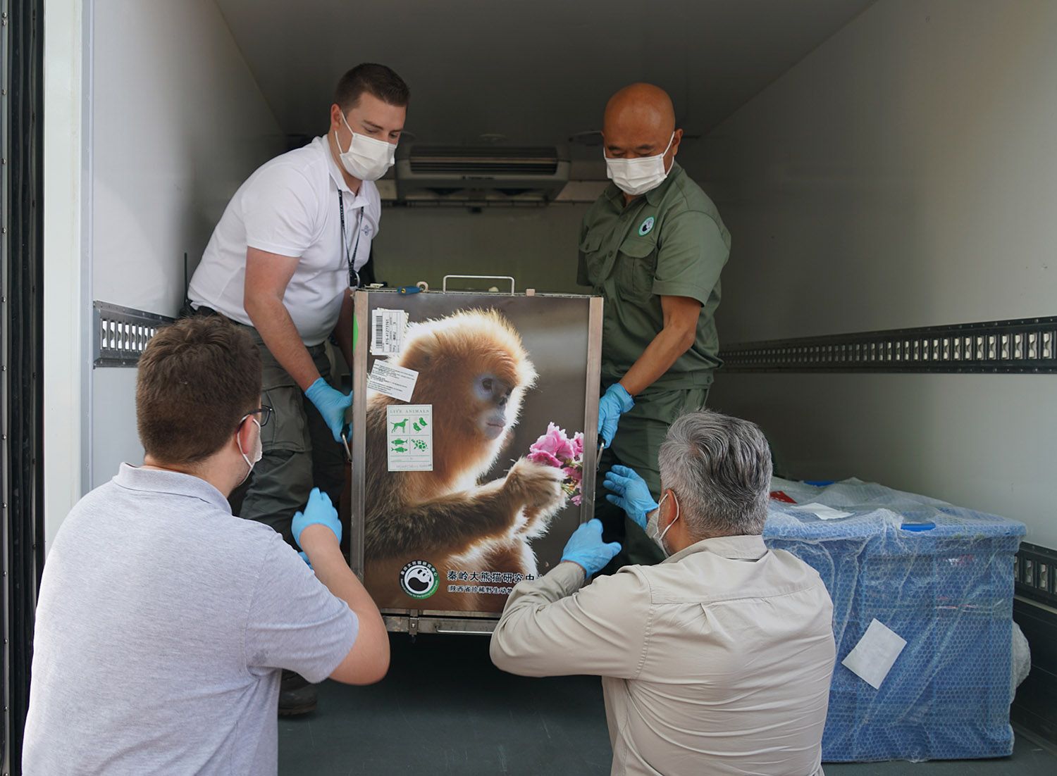 入园后,它们将封闭式栖居于园方特意准备的一座中国风格的楼阁建筑中,完成一个月的检疫隔离后与公众正式见面。图为工作人员转运金丝猴。