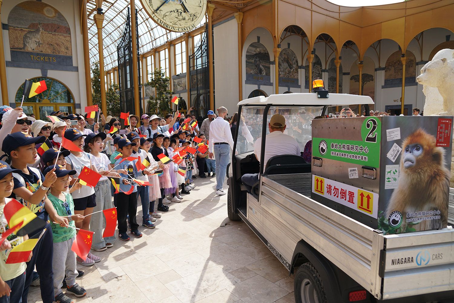 当地时间14日下午,在隆重的欢迎仪式中,来自中国的三只金丝猴抵达比利时天堂动物园。