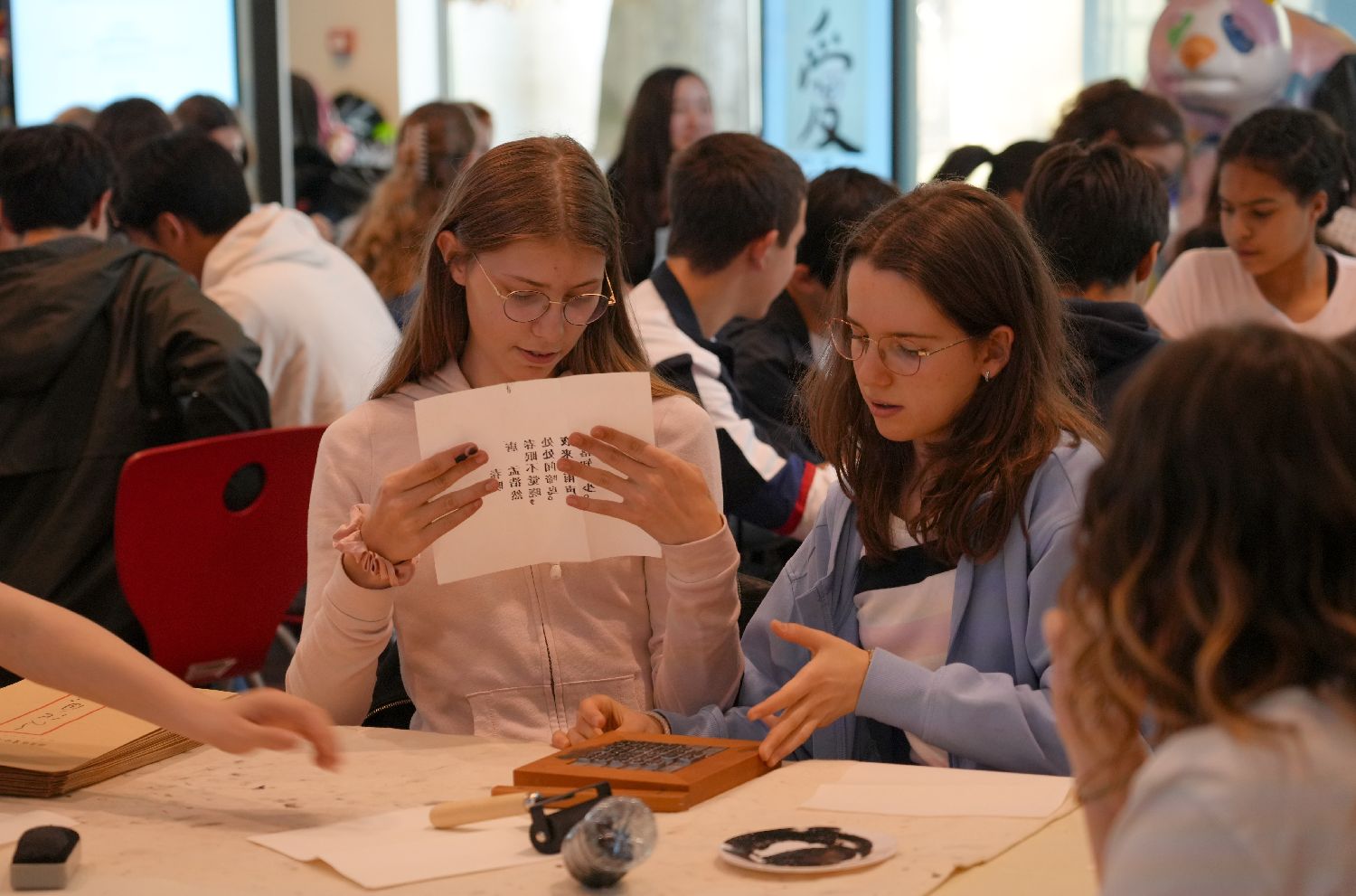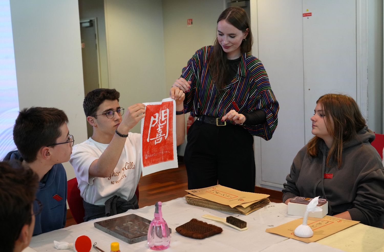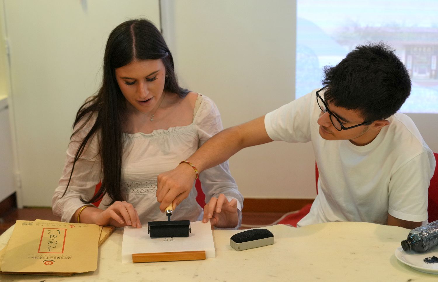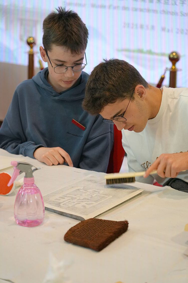 本次活动由巴黎中国文化中心与湖南省文化和旅游厅共同主办、湖南省宋旦汉字艺术博物馆承办。图为5月22日,在法国巴黎,当地学生在活动现场体验古法拓印。(图片来源:本文图片均自新华社)