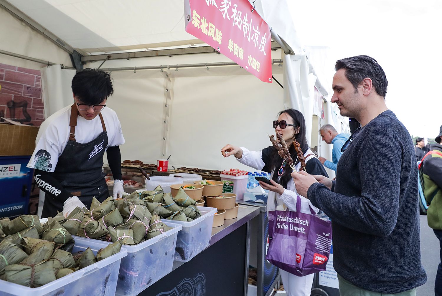 此外还设有中外美食摊位、传统文化互动体验区、亲子休闲区等,吸引了众多当地市民家庭和游客参与。图为5月24日,民众在第二届德国法兰克福国际龙舟友谊赛赛场周边设置的美食摊位购买美食。