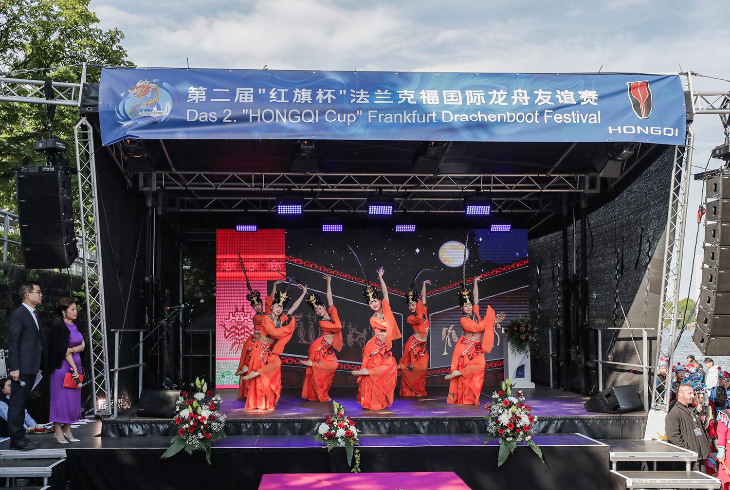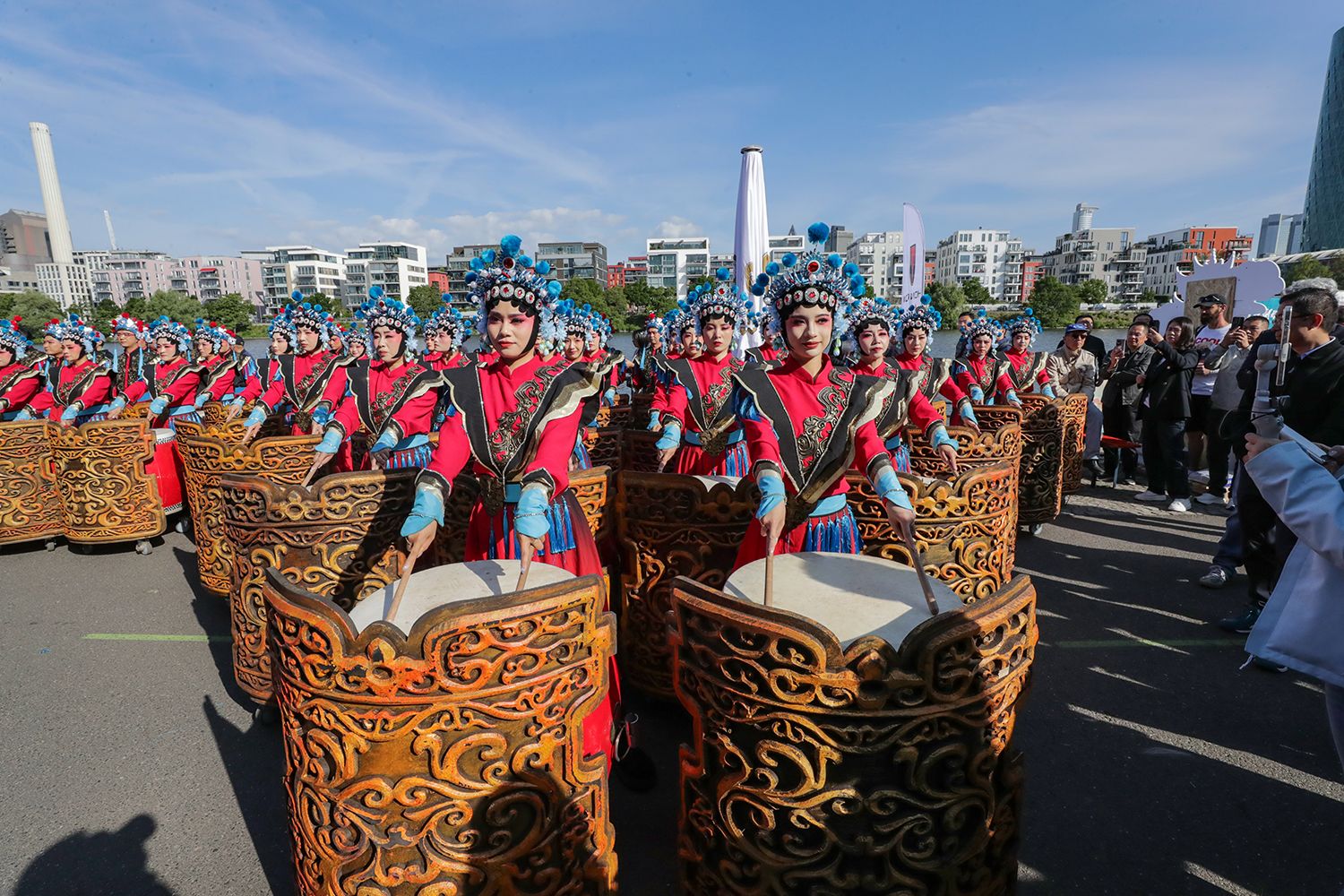 赛场周边还举行了各国传统歌舞表演,让观众体验多元文化。图为演员在第二届德国法兰克福国际龙舟友谊赛期间表演中国陕西神木杨家将战鼓。
