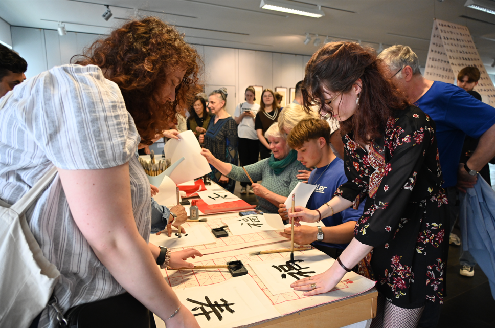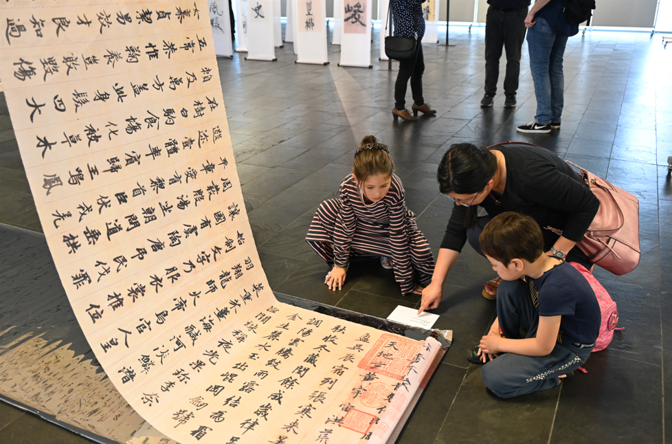 当地时间6月1日,“兰亭·雅集——中国书法展”在柏林中国文化中心开幕。图为观众参与现场互动。