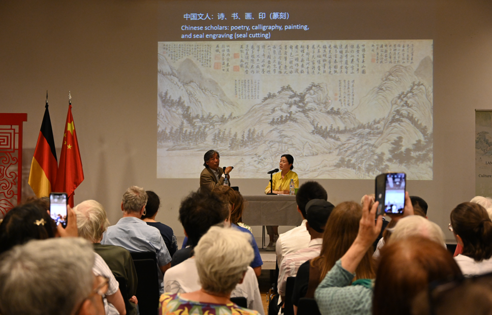 当地时间6月1日,“兰亭·雅集——中国书法展”在柏林中国文化中心开幕。图为《篆刻艺术》讲座现场。