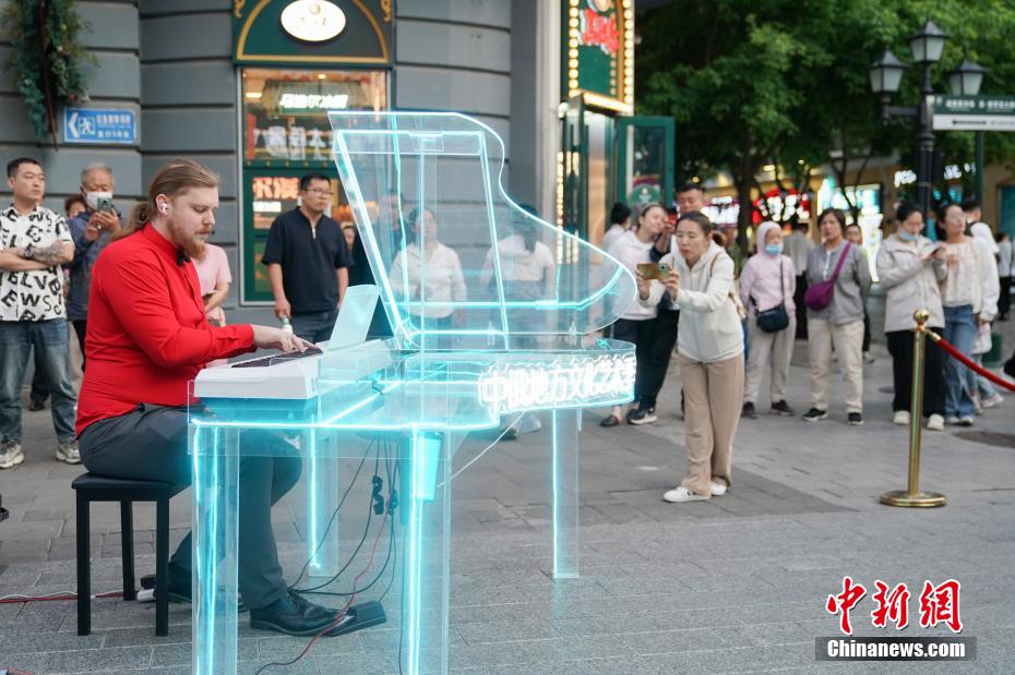 图为6月4日,俄罗斯艺术家在哈尔滨中央大街街头弹奏钢琴。(图片来源:本文图片均来自中新网)