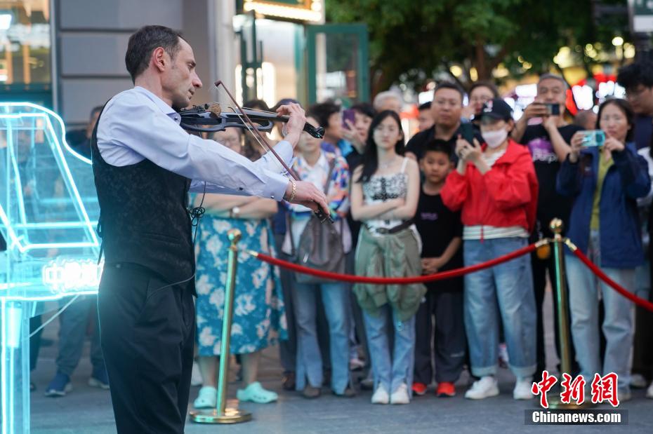图为6月4日,俄罗斯艺术家在哈尔滨中央大街街头进行小提琴演奏。