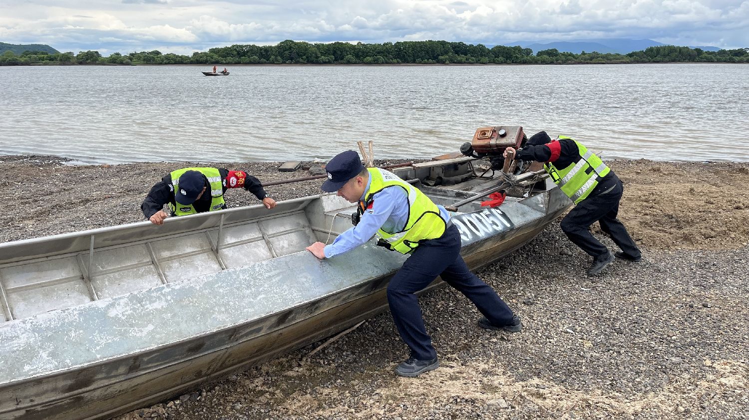 6月11日零时起,中俄界江乌苏里江干流水域全面启动伏季禁渔期。图为6月10日,黑龙江出入境边防检查总站双鸭山边境管理支队民警帮助渔民将渔船拖上岸。(图片来源:中新社)