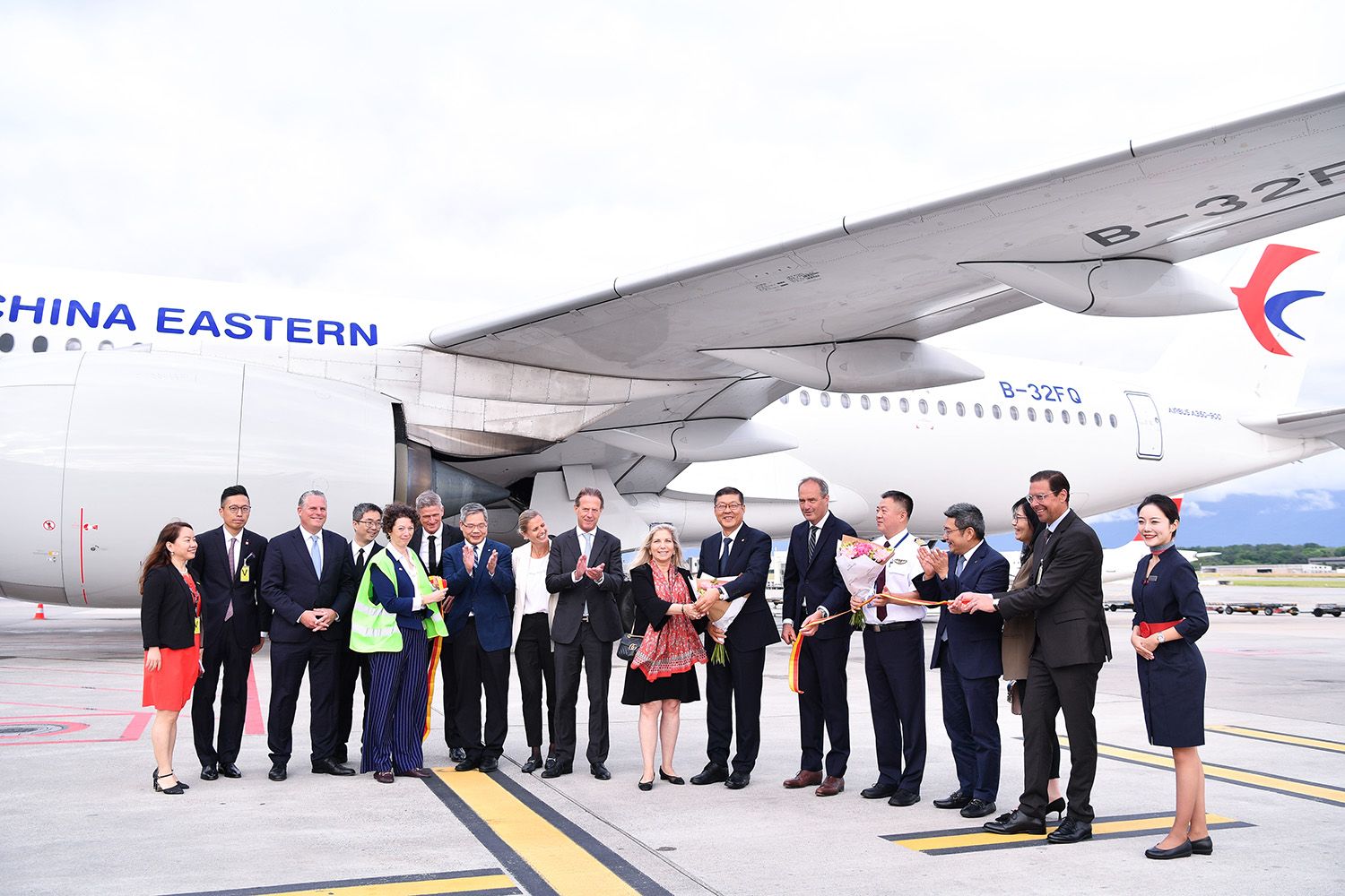 当地时间16日7时25分,从上海浦东国际机场起飞的MU217航班平稳降落在瑞士日内瓦国际机场,缓缓穿过象征民航最高礼仪的“水门”,圆满完成从“东方明珠”上海到“和平之都”日内瓦的首航。图为6月16日在瑞士日内瓦国际机场拍摄的中国东方航空公司上海至日内瓦直飞航线的剪彩仪式。(图片来源:本文图片均自新华社)