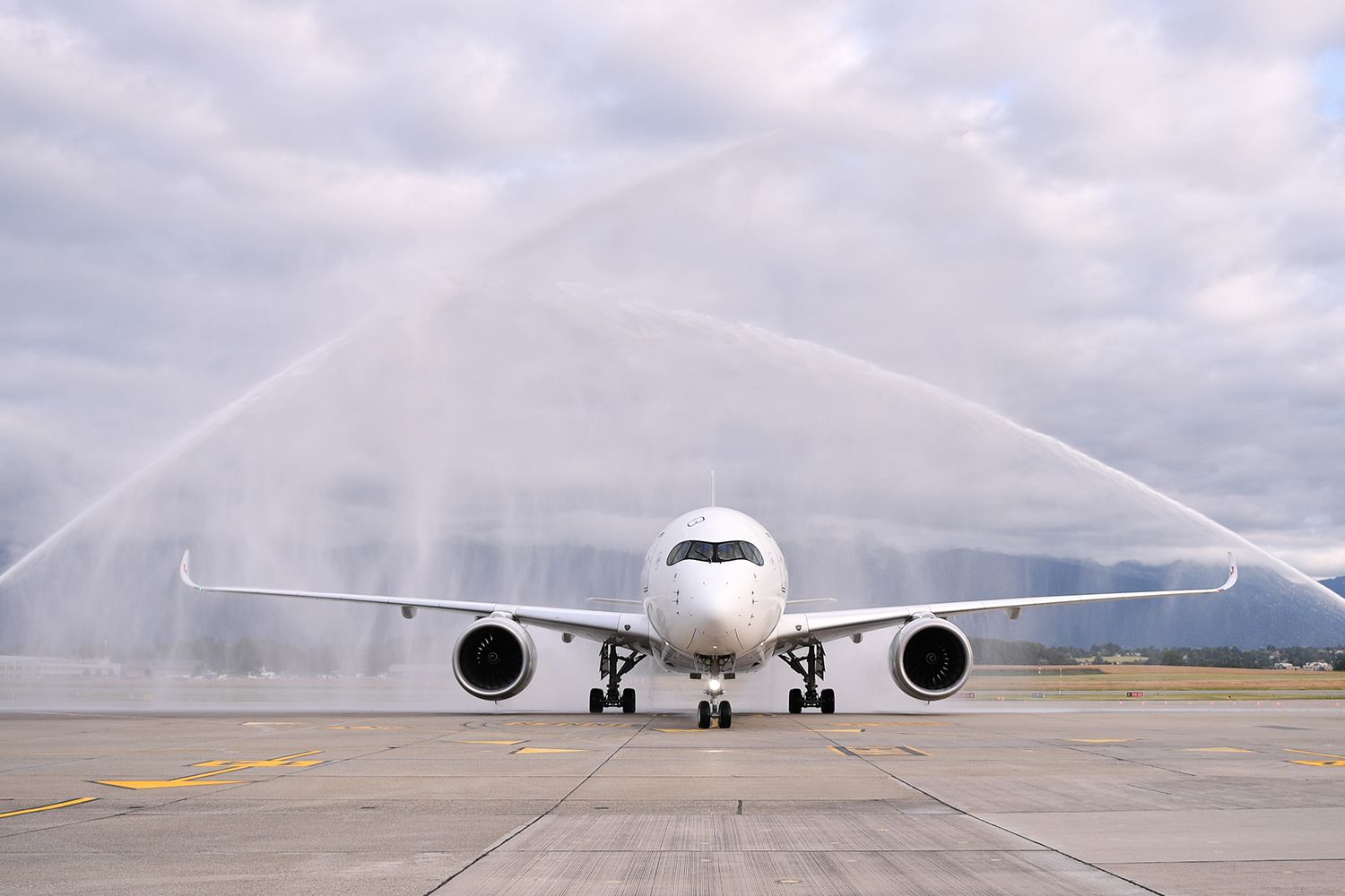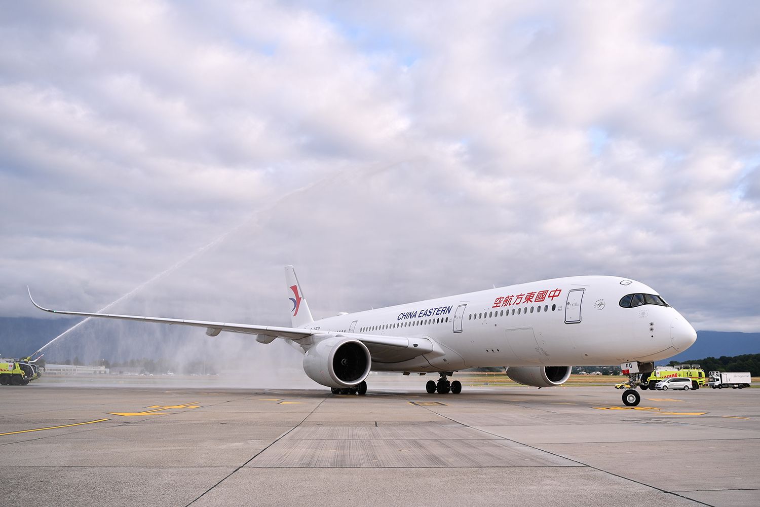 6月16日,在瑞士日内瓦,从上海浦东国际机场起飞的MU217航班穿过象征民航最高礼仪的“水门”。
