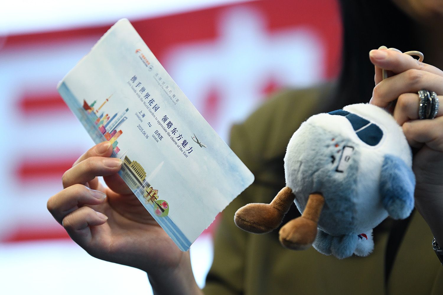 MU217航班乘客展示为纪念上海至日内瓦首条直飞航线开通制作的登机牌和纪念品。