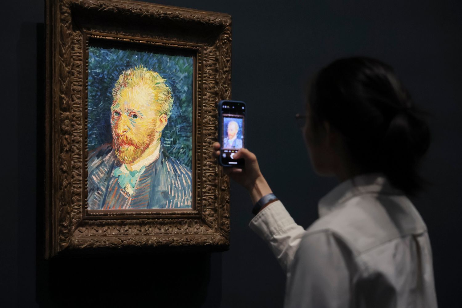 6月18日,受邀嘉宾在“缔造现代:来自巴黎奥赛博物馆的艺术瑰宝”展览现场拍摄梵高的《自画像》。