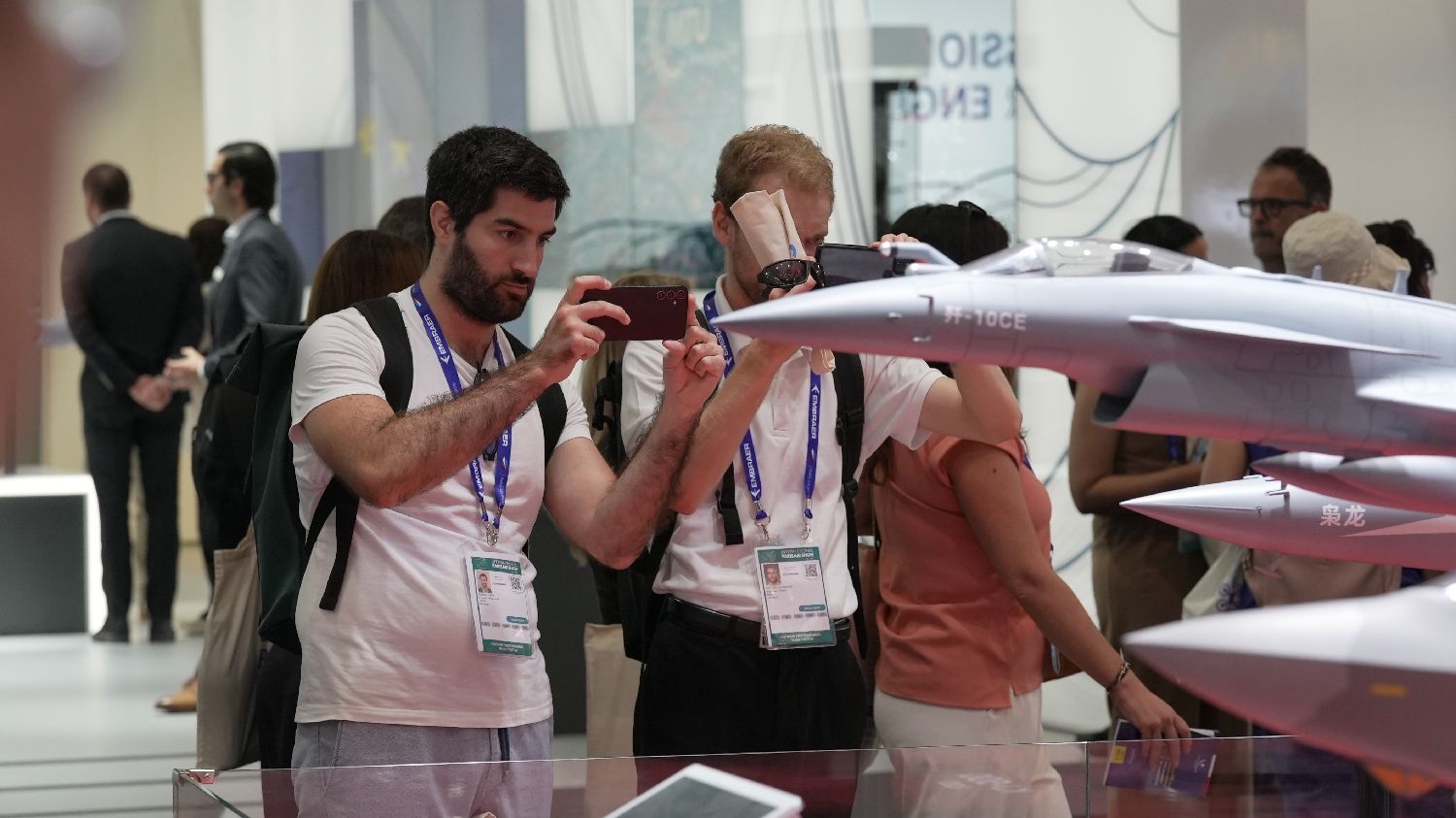 歼-10CE、“枭龙”FC-1战斗机,L15A教练机,直-10ME直升机,PL-15E空空导弹等明星军贸产品再度集结,助力中国航空装备国际化市场开拓。图为6月17日,在法国巴黎近郊举行的第55届巴黎航展上,观众参观中国航空工业集团展台。