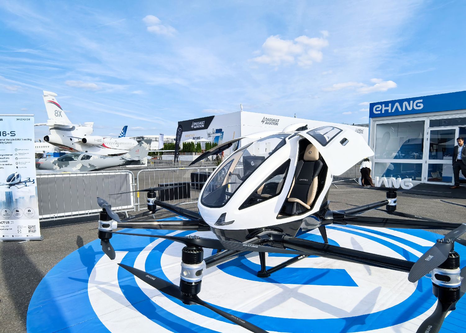 在露天展区,城市空中交通科技企业亿航智能的EH216-S航空器也吸引了很多目光。这台静态展示的“空中的士”拥有8轴16旋翼,通体白色,极具科幻感,不少参观者前来问询,甚至登上座位自拍。图为亿航智能公司展出EH216-S航空器。