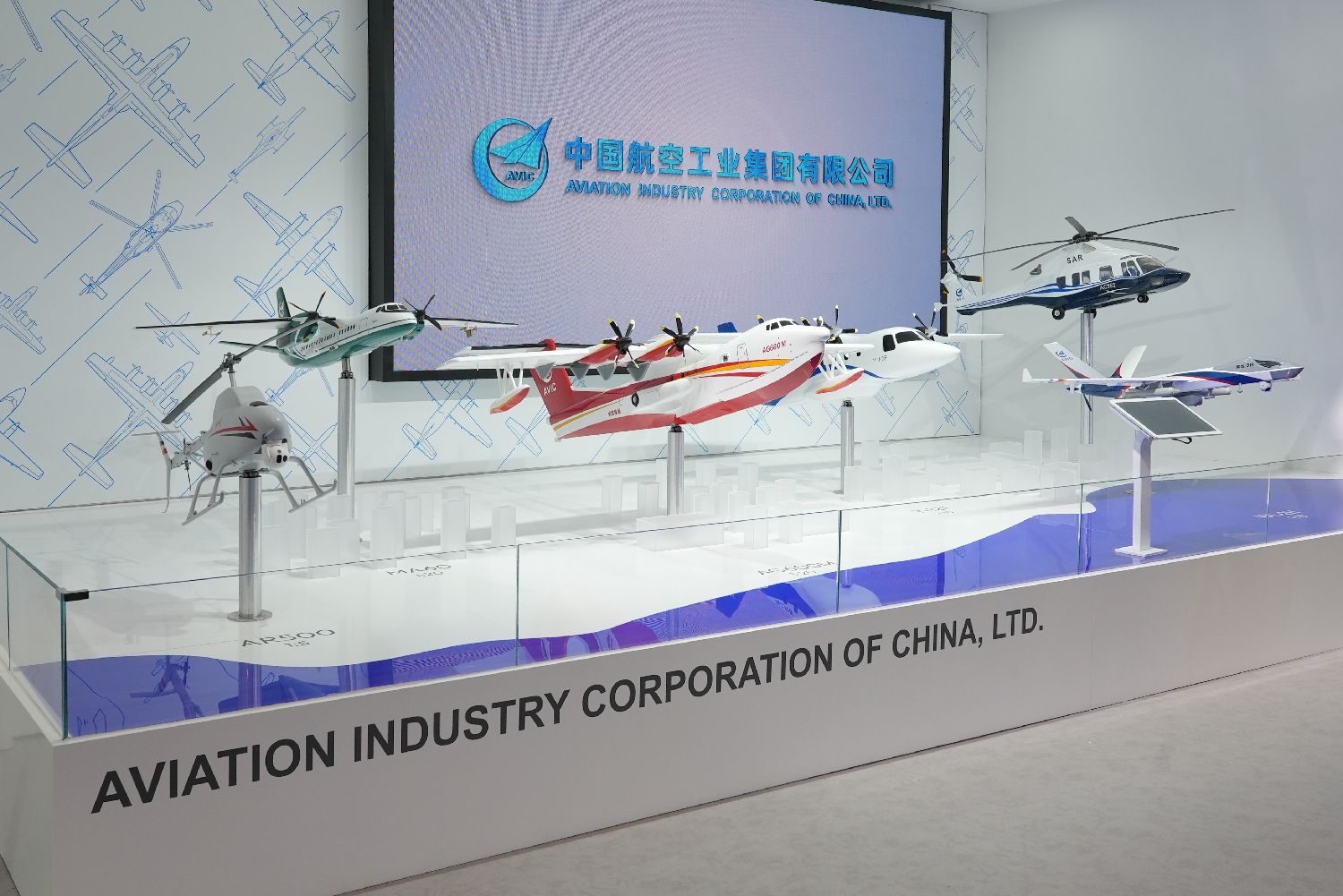 在第55届巴黎航展上拍摄的中国航空工业集团展台产品模型。