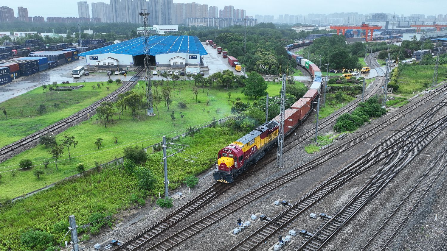 19日,第5000列中欧班列(合肥)鸣笛启程。(无人机照片)(图片来源:中新社)