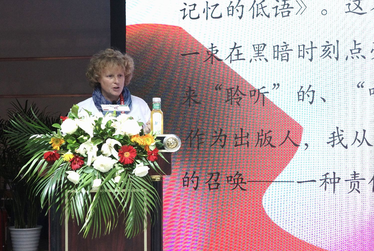 布雷斯勒是哲学博士、大学教师,同时也是“丝绸之路出版社”的创始人与主编。她曾出版《维吾尔假新闻的终结》《发现西藏》等多部真实反映中国的书籍,2024年获得第十七届中华图书特殊贡献奖。图为布雷斯勒致辞。