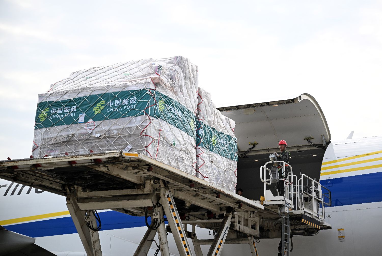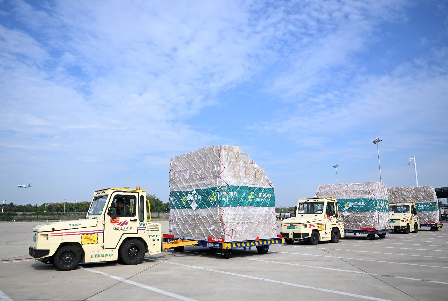 6月23日,郑州新郑国际机场工作人员在为中国邮政郑州至卢森堡国际货运航线首航货机运送货物。