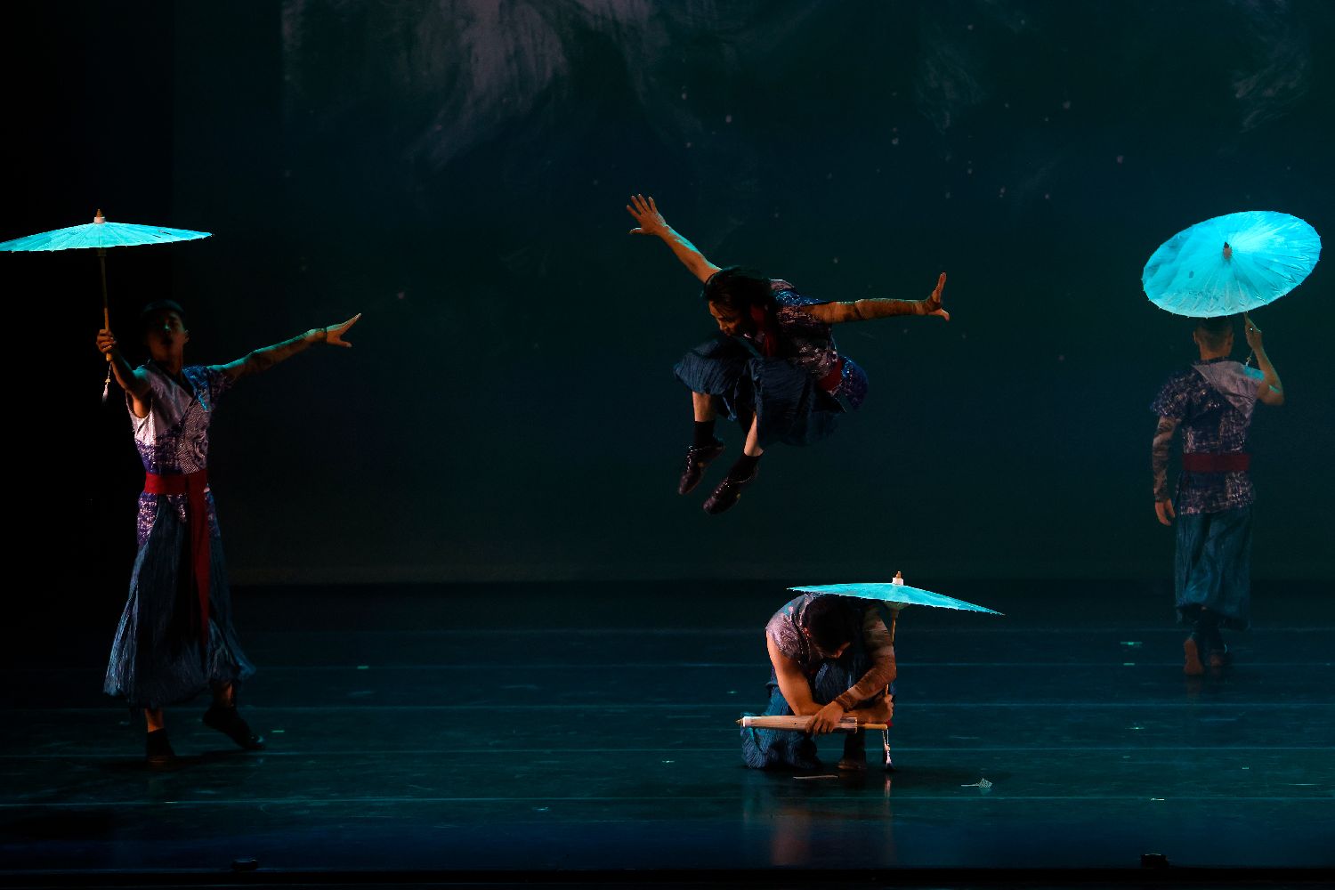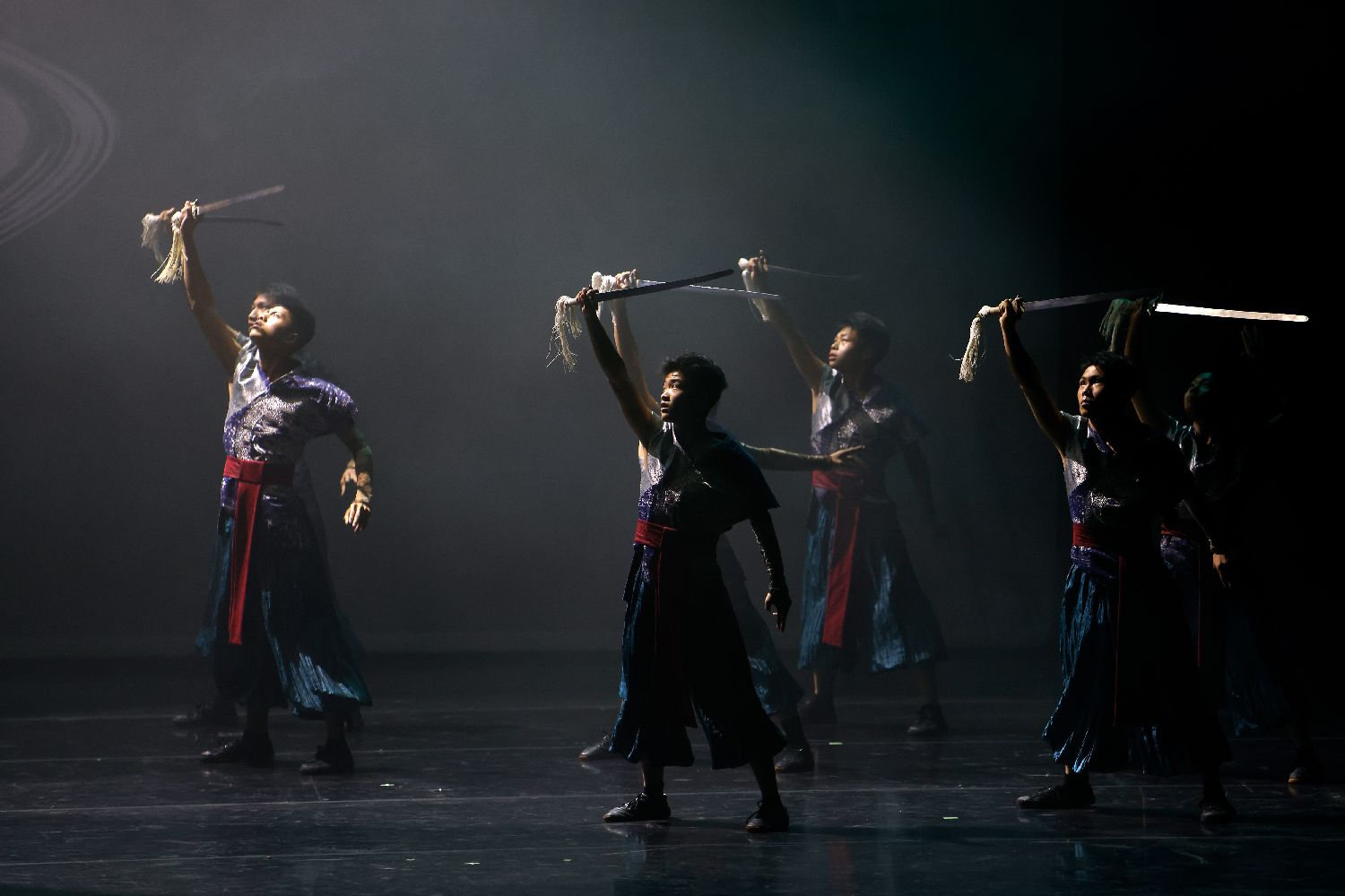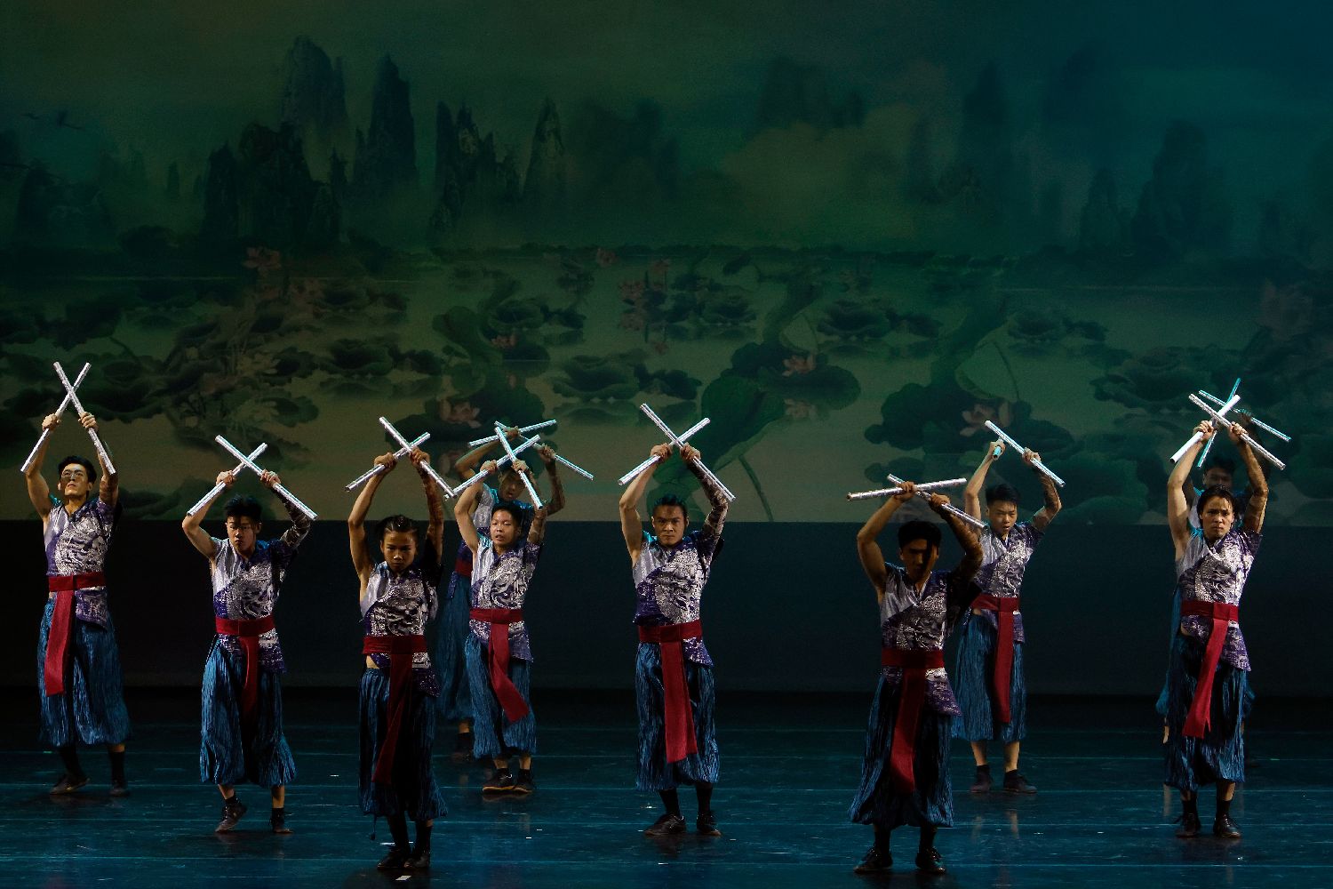 本场演出由中国影星成龙发起并组建的“龙韵武艺团”倾情呈现。演出以中国武术发展脉络为主线,通过舞蹈与多媒体互动手段,展现中华武术从兵器实用到精神修养、从江湖侠义到哲学意蕴的文化内涵。图为6月28日晚,中国“龙韵武艺团”表演功夫舞剧《十一武者》。(图片来源:本文图片均据新华社)