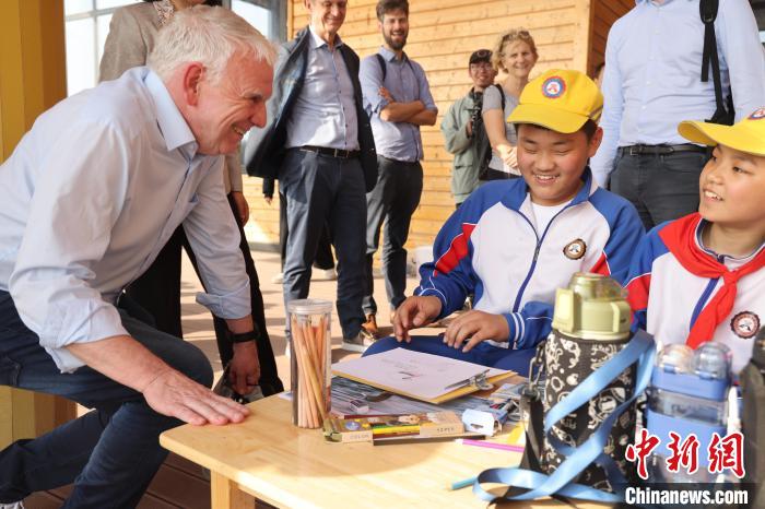 2024年4月12日,德国联邦经济合作与发展部国务秘书约亨·弗拉斯巴特同参加衡水湖自然笔记活动的小学生交流。(图片来源:中新社)