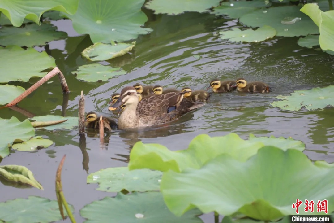 2025年6月1日,衡水湖中的斑嘴鸭亲鸟带雏鸟活动。(图片来源:中新社)