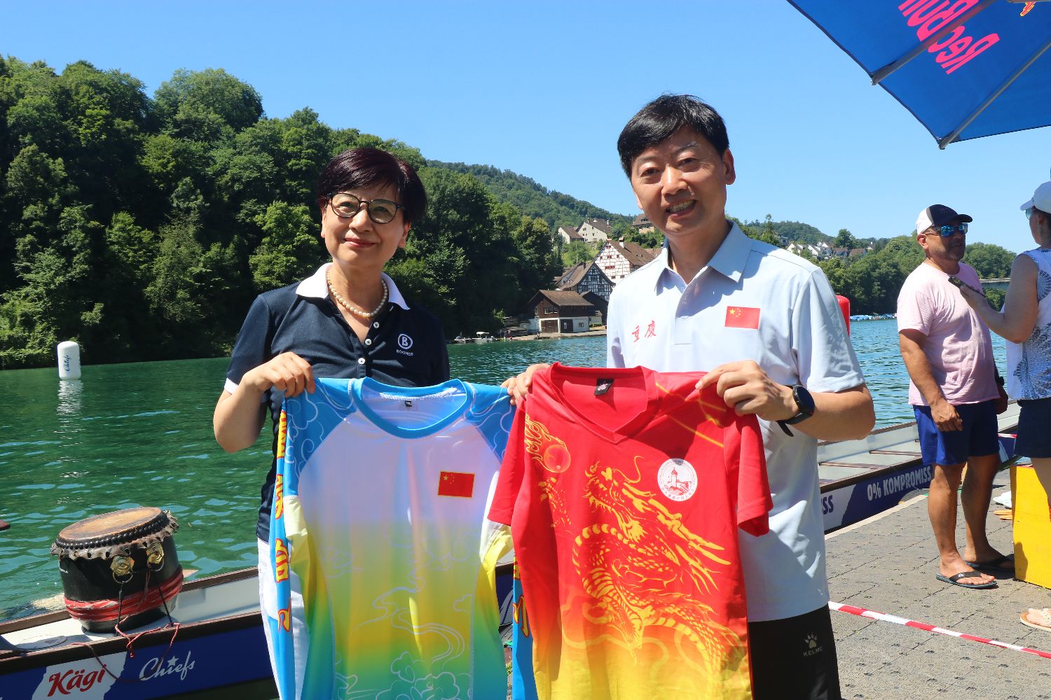 6月29日,在瑞士埃格利绍,中国重庆合川队代表与瑞士苏黎世州华侨华人组织的“龙战队”代表交换队服。