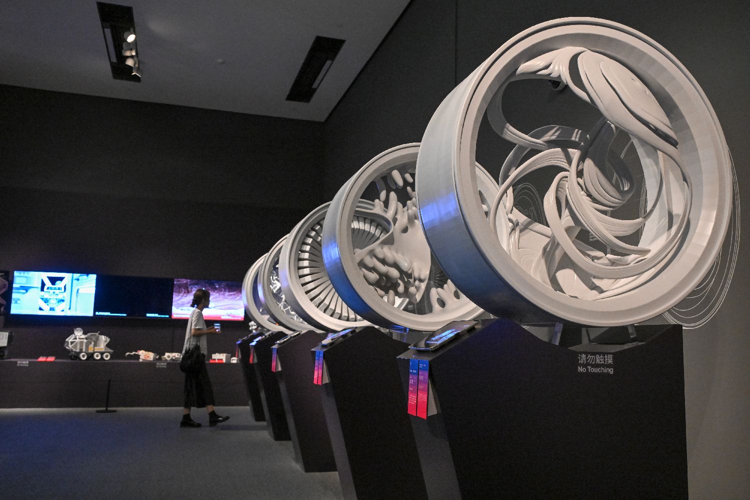 展览把科学探索和艺术诠释融为一体,由科学家与艺术家联合,通过古代文物、现代动态雕塑、3D影像、交互装置、沉浸式体验、概念设计等多元作品形态,以艺术化的方式呈现从宇宙中采集的抽象数据,构建一次“科学+艺术+历史”的跨界对话。图为7月2日,观众参观巡星雕塑。