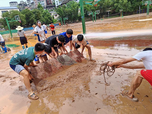 2025年6月26日,众人在清理榕江一中球场。(图片来源:本文图片均为受访者供图)