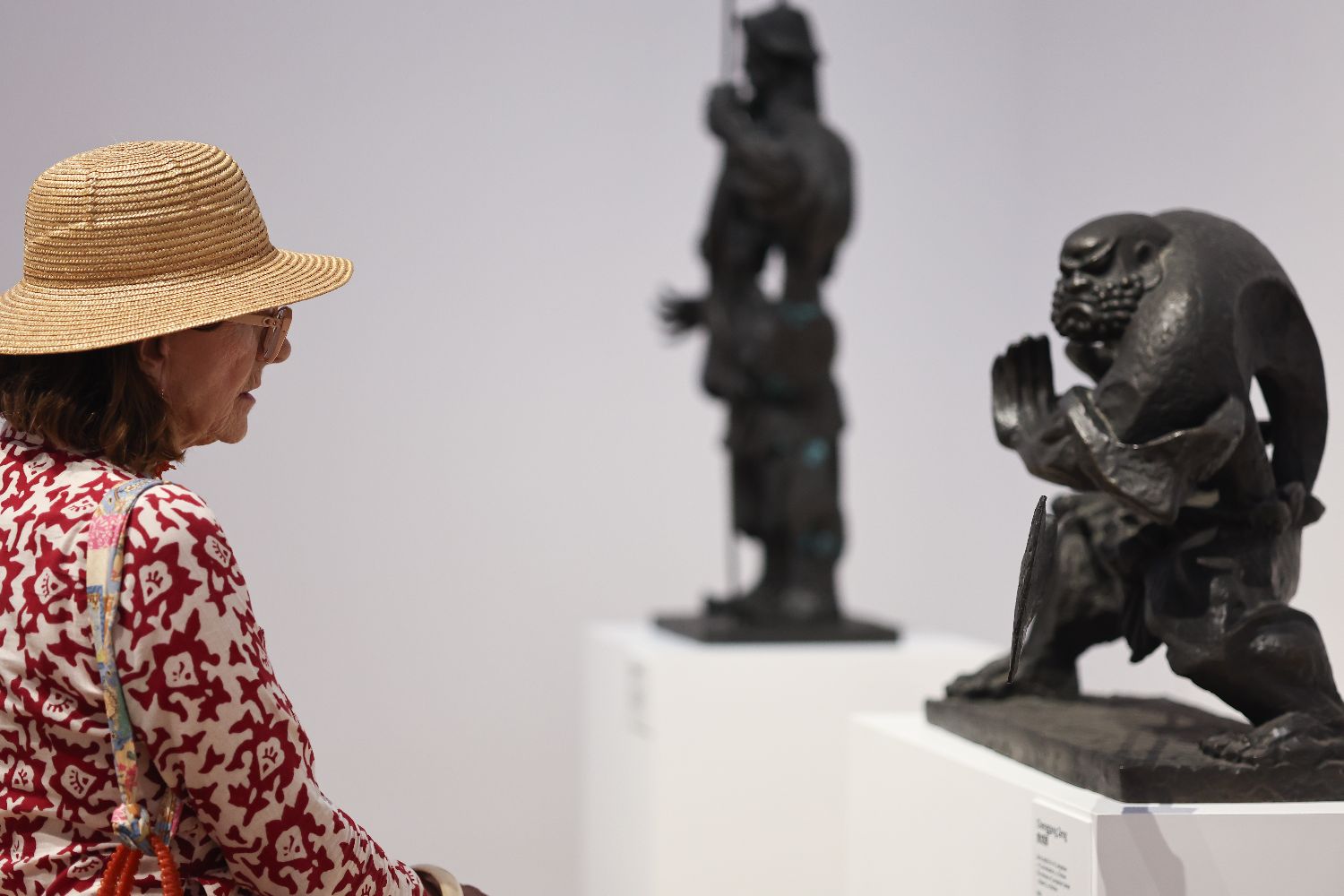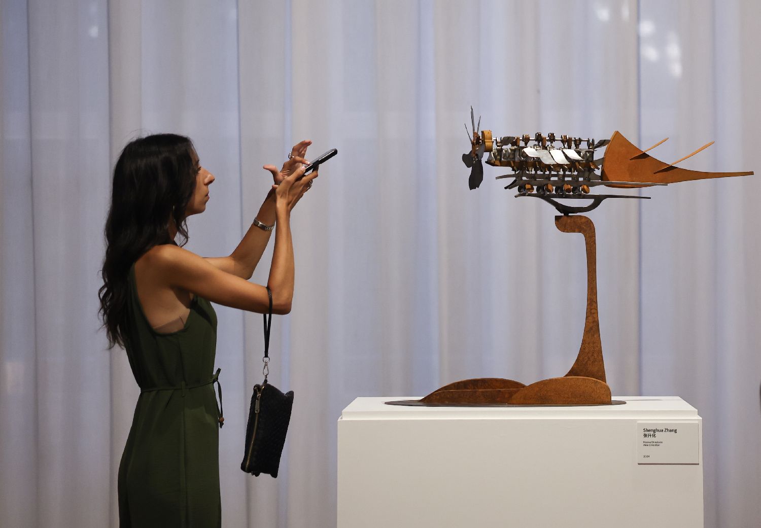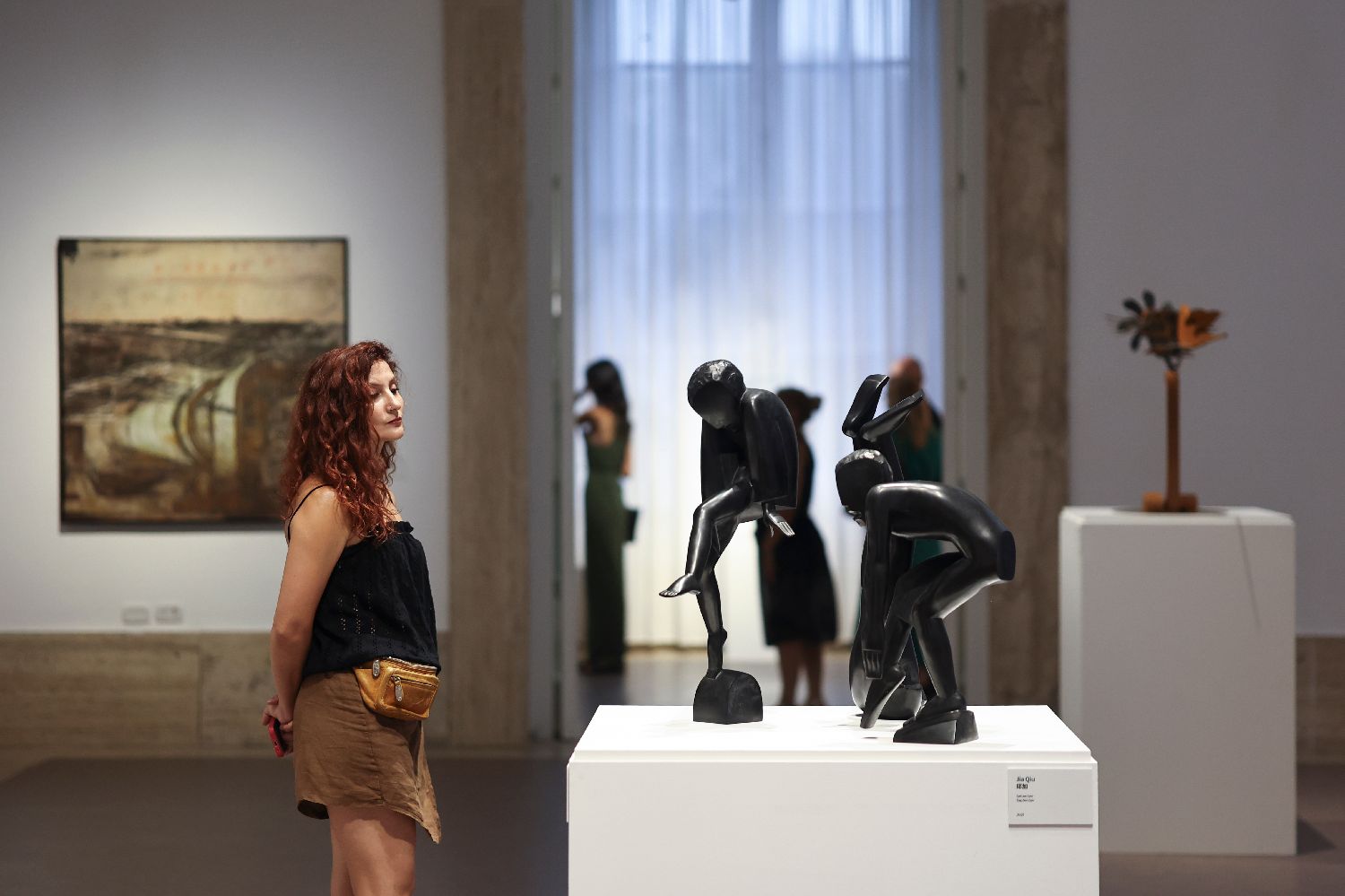 本次展览将持续至9月14日,汇聚了47位中国和意大利艺术家的作品,通过绘画、雕塑等多元媒介,构建起一场跨越地域、文化与时空的当代艺术对话。图为7月14日,参观者在意大利首都罗马观看“2025无问西东国际对话展:从上海到罗马”的展出作品。(图片来源:本文图片均自新华社)