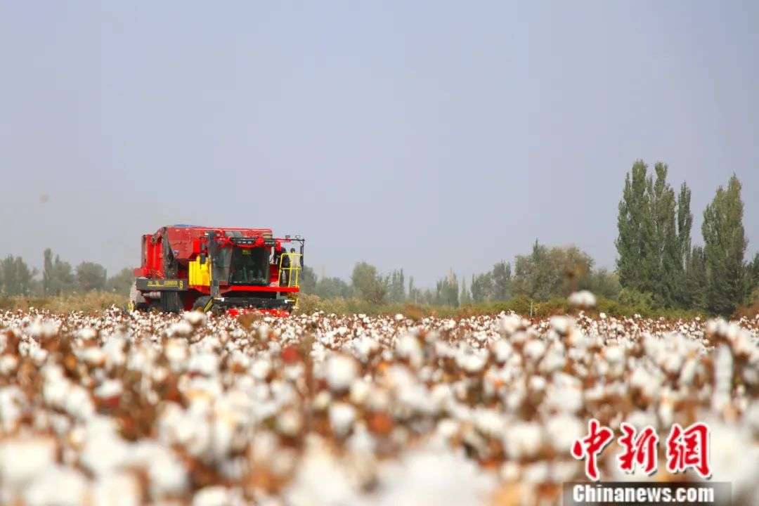 新疆尉犁县一台采棉机正在棉田采摘棉花。(图片来源:中新社)