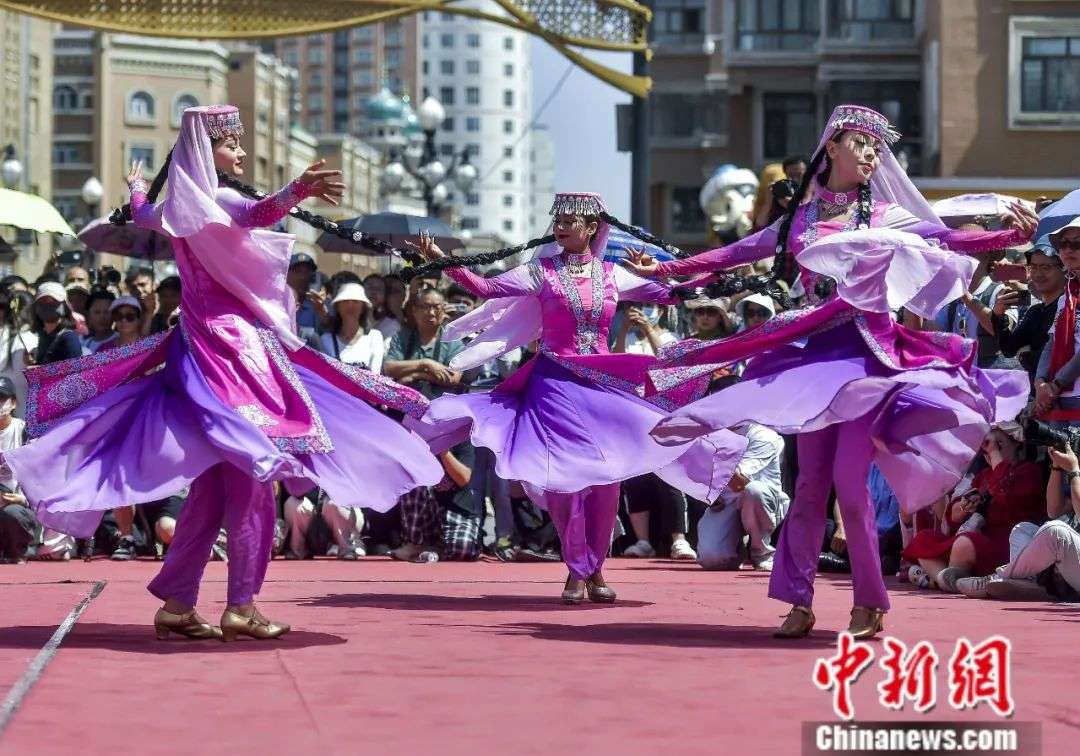 6月6日,新疆乌鲁木齐市大巴扎步行街,民众跳起欢快的民族舞蹈,欢度古尔邦节。(图片来源:中新社)