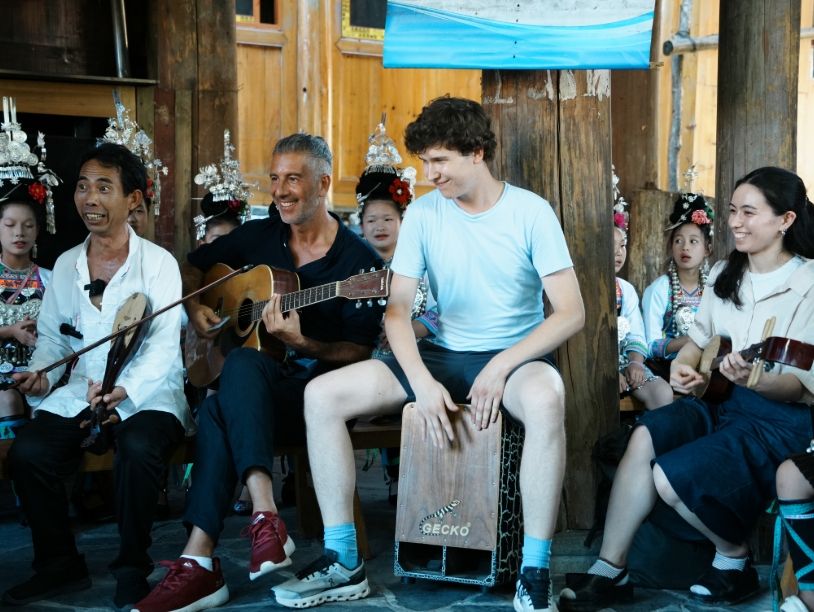 盛夏的贵州省黎平县黄岗侗寨凉风习习,侗族青年指间的琵琶声、妇女孩童的侗族大歌合声在鼓楼下回荡。英国打击乐演奏者博丹·斯克雷普卡(Bogdan Skrypka)的鼓点与意大利作曲人安德烈亚·格拉尼齐奥(Andrea Granitzio)的吉他也应声加入,琵琶、歌声、吉他、鼓点在鼓楼下交织,上演了一场跨越文化的合奏。