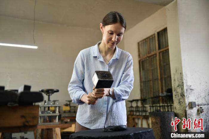爱林正在体验锤墨技艺。(图片来源:中新网)
