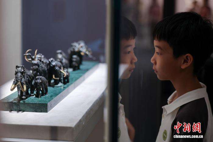 7月18日,一位小朋友参观展出的安德烈·科瓦尔丘克雕塑作品《猛犸象群》。(图片来源:本文图片均来自中新网)