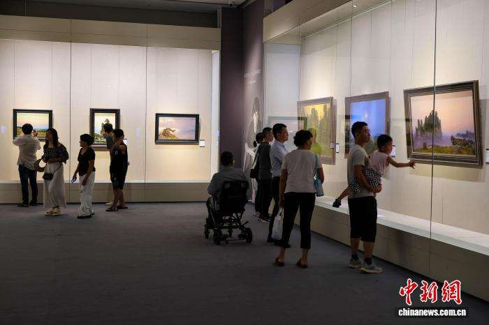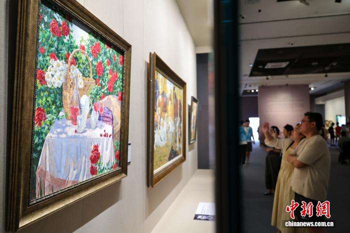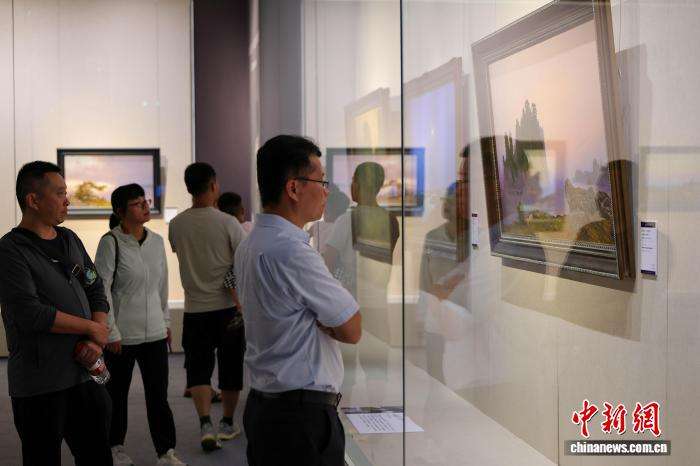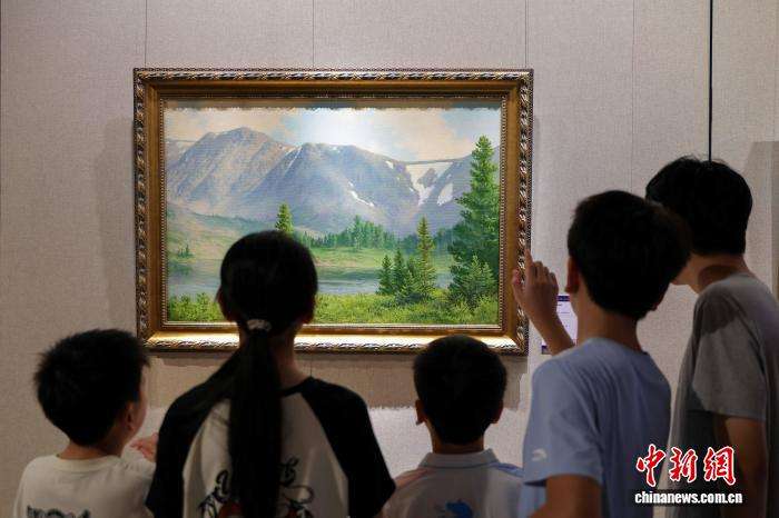 7月18日,展出的德米特里·比特林科油画作品《卡拉科尔湖》吸引参观者。