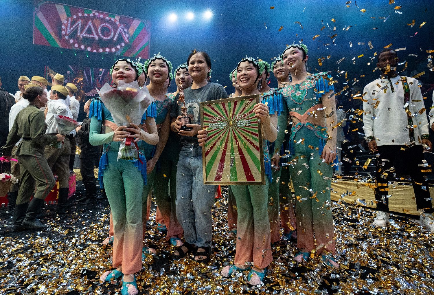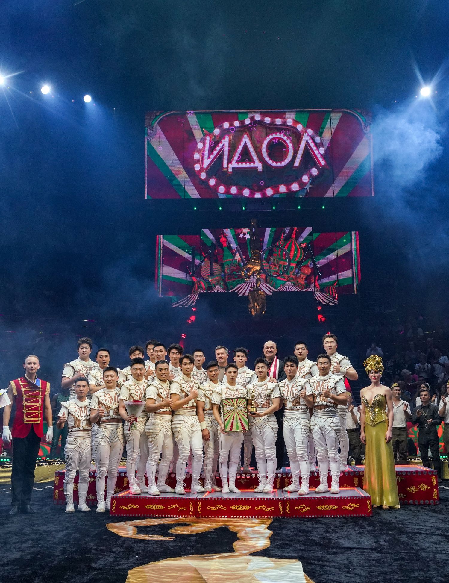 7月20日,在俄罗斯莫斯科,获得专业评委会金偶像奖的中国杂技团演员在台上领奖。“偶像-2025”国际马戏艺术节各奖项评选结果20日晚在俄罗斯首都莫斯科国家大马戏剧院揭晓。来自中国杂技团的《驭风凌霄——男子集体车技》获得专业评委会金偶像奖。来自湖南省杂技艺术剧院的《戏韵春苗》获得专业评委会铜偶像奖。(图片来源:本文图片均自新华社)