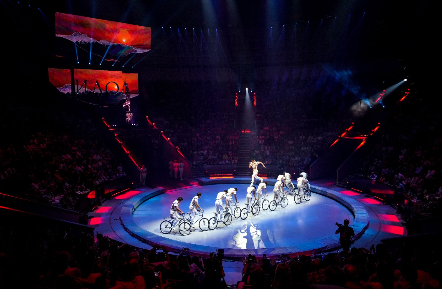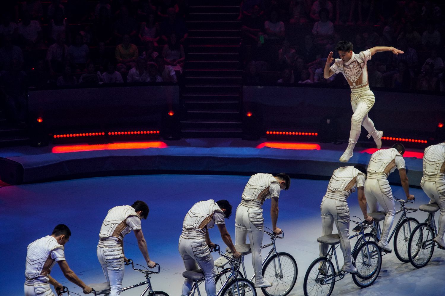 中国杂技团演员表演《驭风凌霄——男子集体车技》。