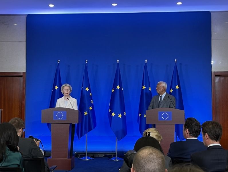 7月24日,欧洲理事会主席科斯塔(右)与欧盟委员会主席冯德莱恩(左)在欧盟驻华代表团驻地举行联合记者会,介绍访华成果,回答中外记者提问。(图片来源:中新社)