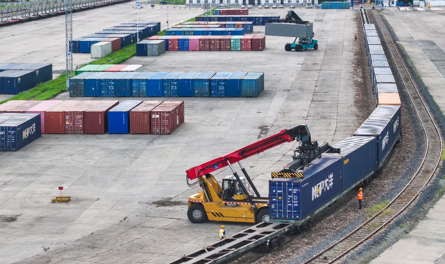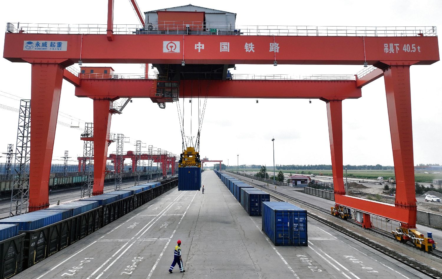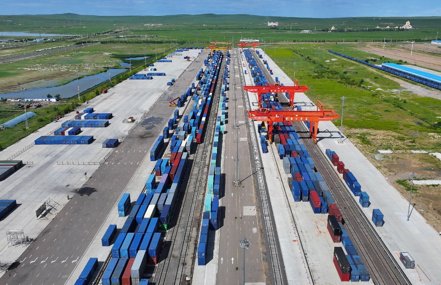 8月6日,中欧班列在中国铁路哈尔滨局集团有限公司满洲里站准轨西场内集结等待发车。中欧班列“东通道”由满洲里、绥芬河、同江三个铁路口岸组成。(图片来源:本文图片均自新华社)
