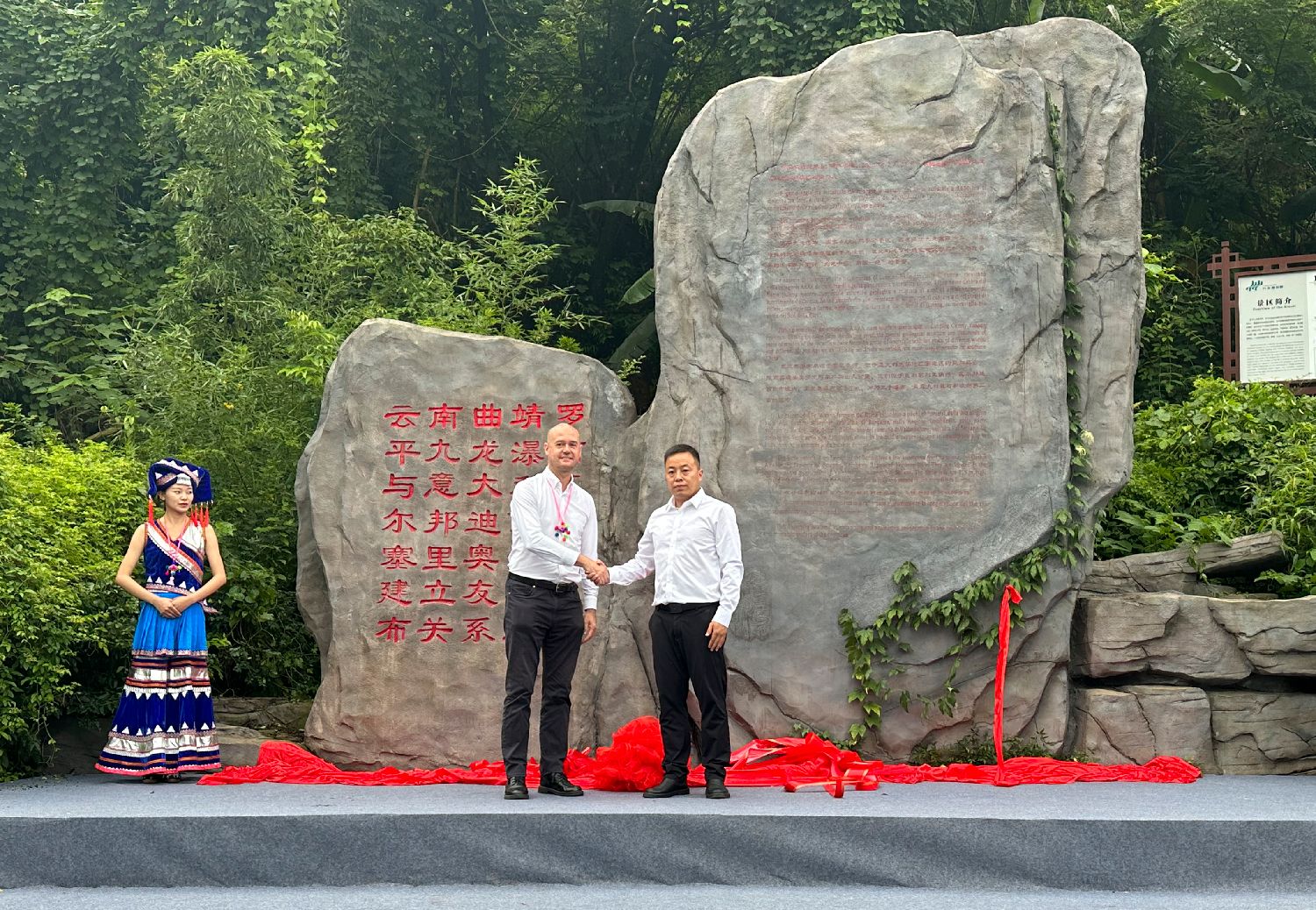 罗平县风光旖旎,独特的喀斯特地貌与河流共同造就了九龙瀑布的奇观。万里之外,意大利贝尔加莫省瓦尔邦迪翁市的塞里奥瀑布从阿尔卑斯山奔泻而下,壮观的景色吸引各国游客。2020年12月,正值中意两国建交50周年,两座瀑布正式缔结为友好瀑布。图为2023年8月7日,时任中国意大利商会董事罗仁舟(左)代表意大利瓦尔邦迪翁市来到九龙瀑布为中意缔结友好瀑布纪念碑揭幕。